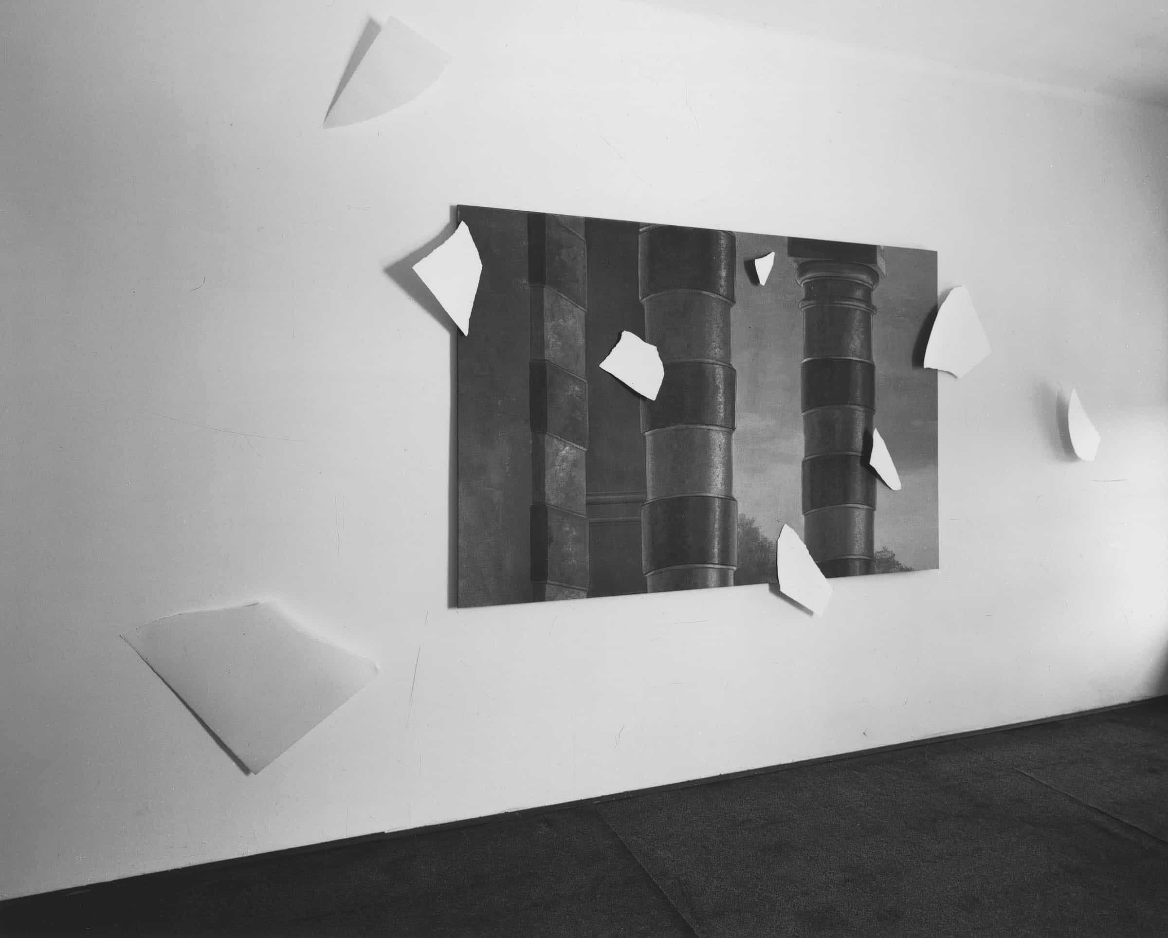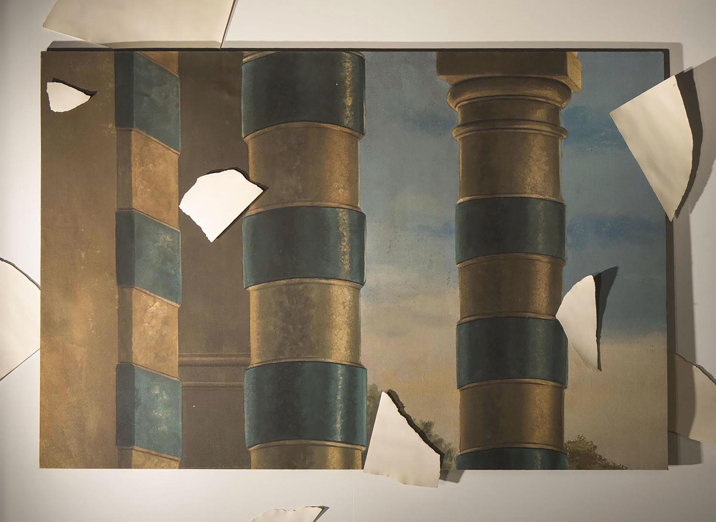 The first episode offers the first detail of the eighteenth-century painting (upper left corner) matched with a sheet of drawing paper, torn into nine pieces some of which distributed on the canvas, and others on the wall. As it is the inaugural work in the cycle, it foreshadows its program: the dispersion of the original image, divided into nine details.