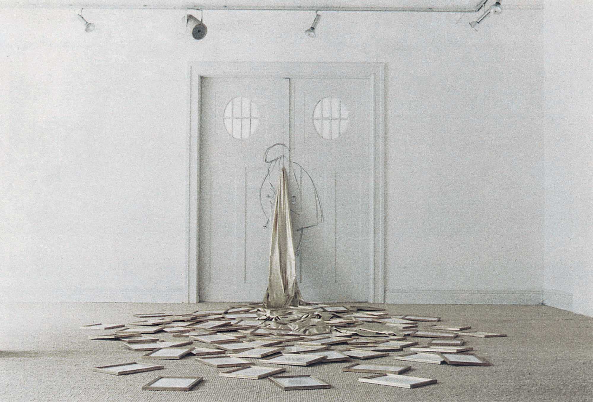 • 1982, Berlin, Neuer Berliner Kunstverein: part V; elements strewn across the floor, on the golden cloak of a figure drawn on the wall borrowed from a painting by Jean-Antoine Watteau.