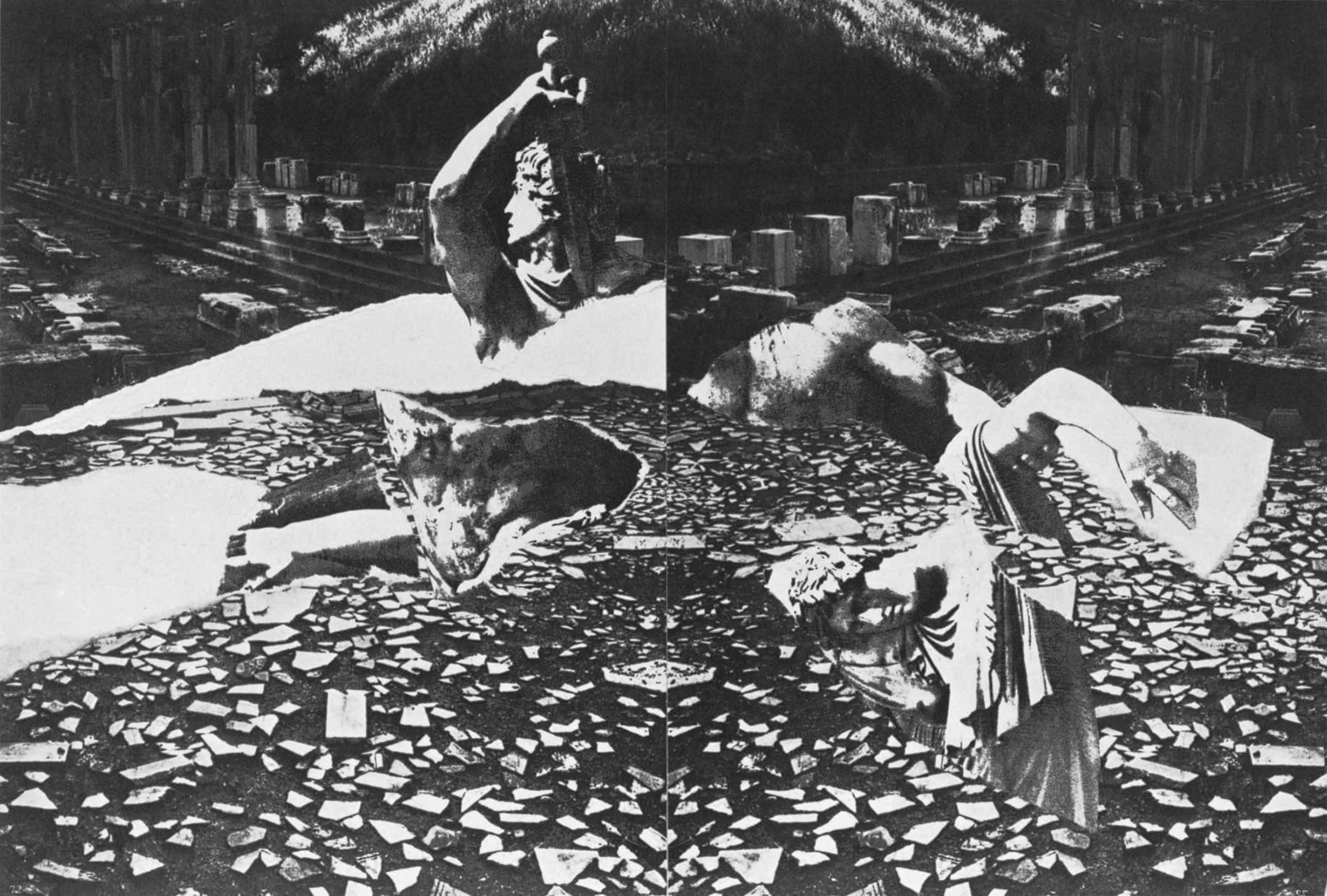 In contrast to the ideal perspective foreshadowed by the specular colonnades in the double image of the Library of Pergamum, in the foreground the gaze drowns surrounded by the fragments of the torn image of The Galatian Suicide, scattered amidst the fragments of a lost architecture.