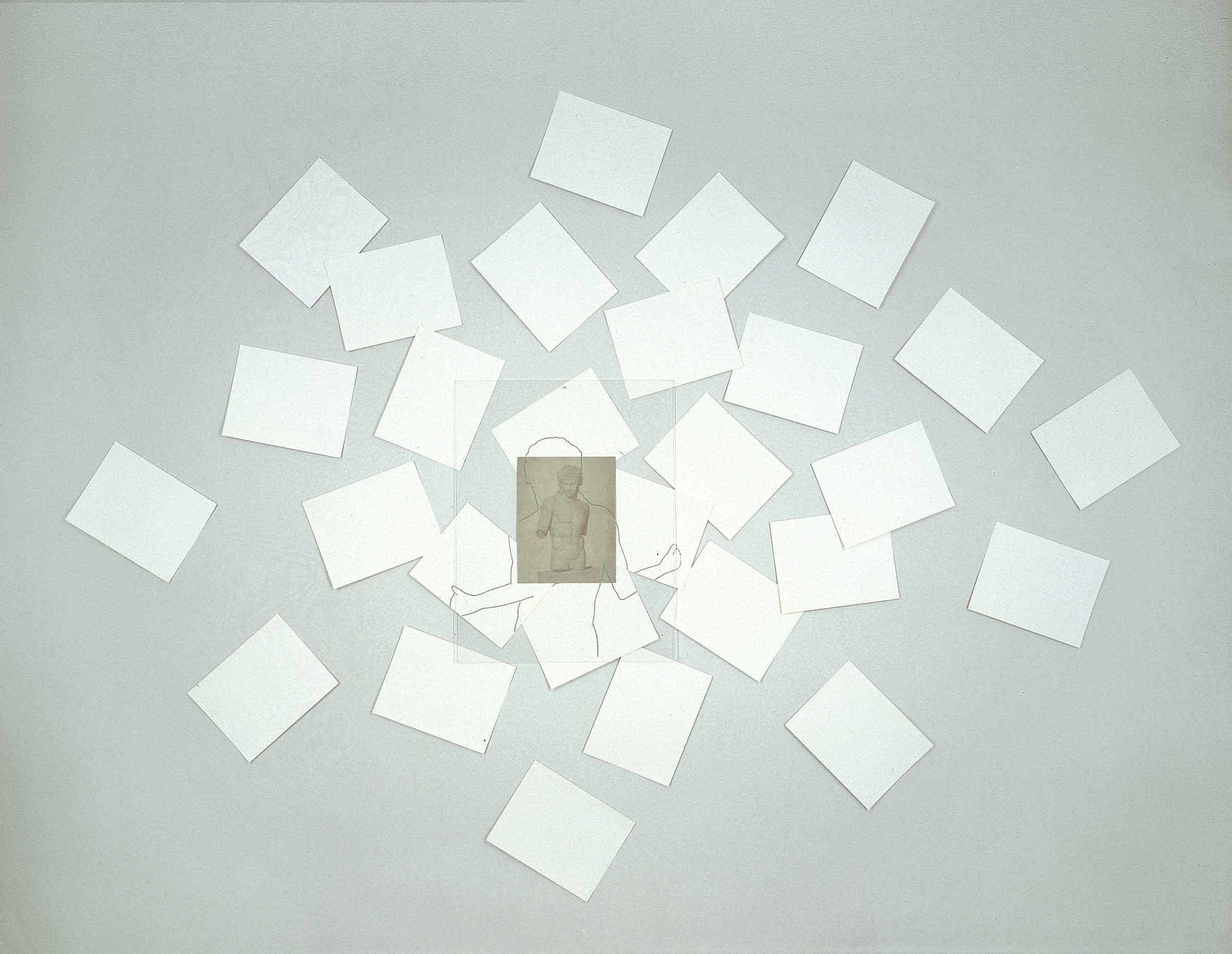 The figure drawn on the wall, seen from behind and associated with a plexiglas sheet that it seems to hold before it, gazes at a hypothetical painting, evoking a stand-in for the viewer. In the trajectory of its gaze is a reproduction of the torso of the Eros of Centocelle, hanging on a wall behind a plexiglas sheet. The antique torso is the model for the drawn figure, which reproduces the profile in natural size. Only the upper part of the body of the figure is traced and it appears at the centre of a multitude of sheets of drawing paper, scattered on the wall gradually thinning out towards the edges of the visual field.