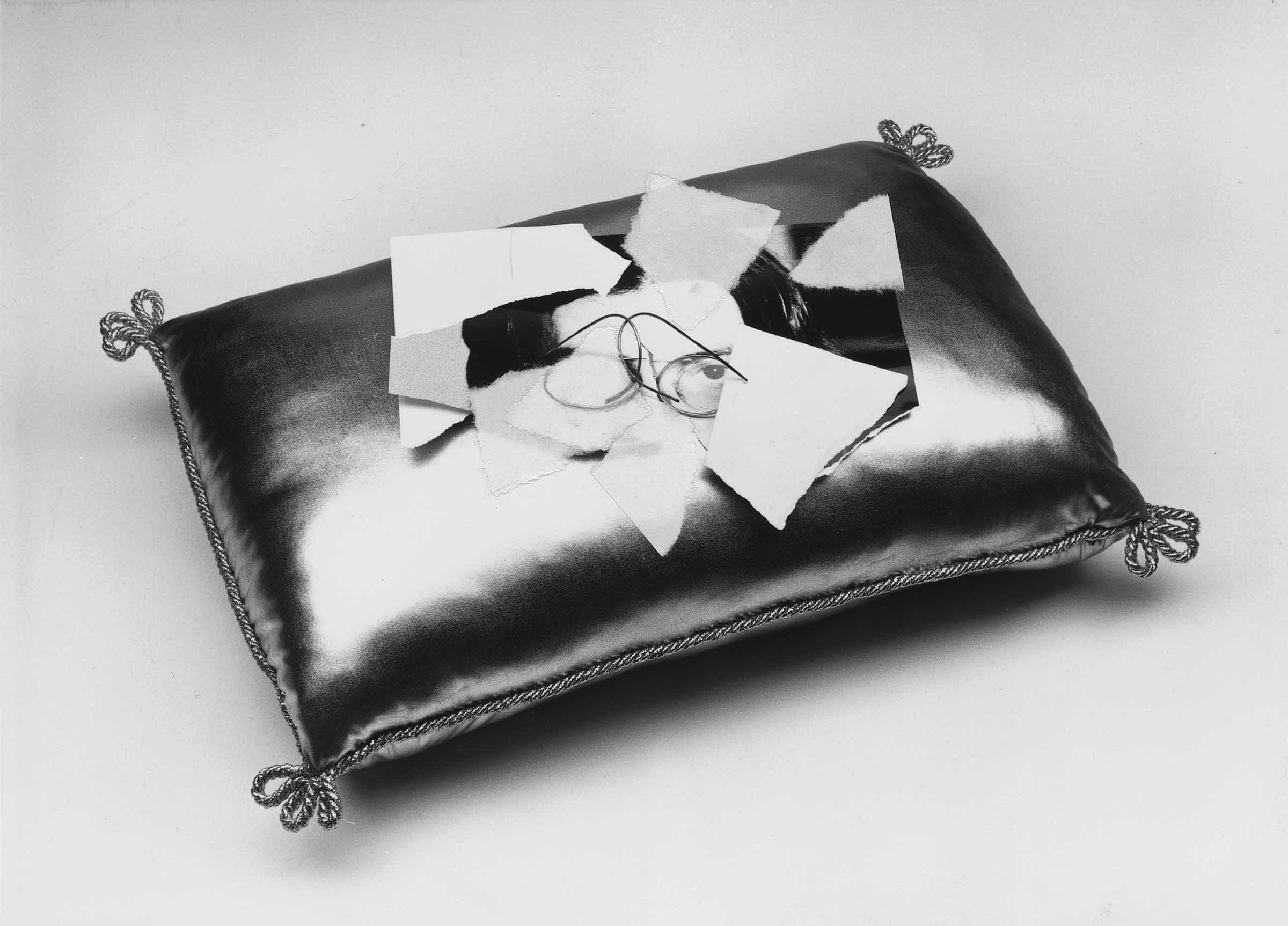 The first in a series of “ornaments offered to Le Temple de la Gloire”,1 arranged on the golden pillow are the pieces of a torn photographic portrait of the artist – taken by Paolo Mussat Sartor in 1971 – partially stuck in the eyeglasses placed where those worn by Paolini in the picture are. The title refers to the date of birth of Jean-Philippe Rameau.