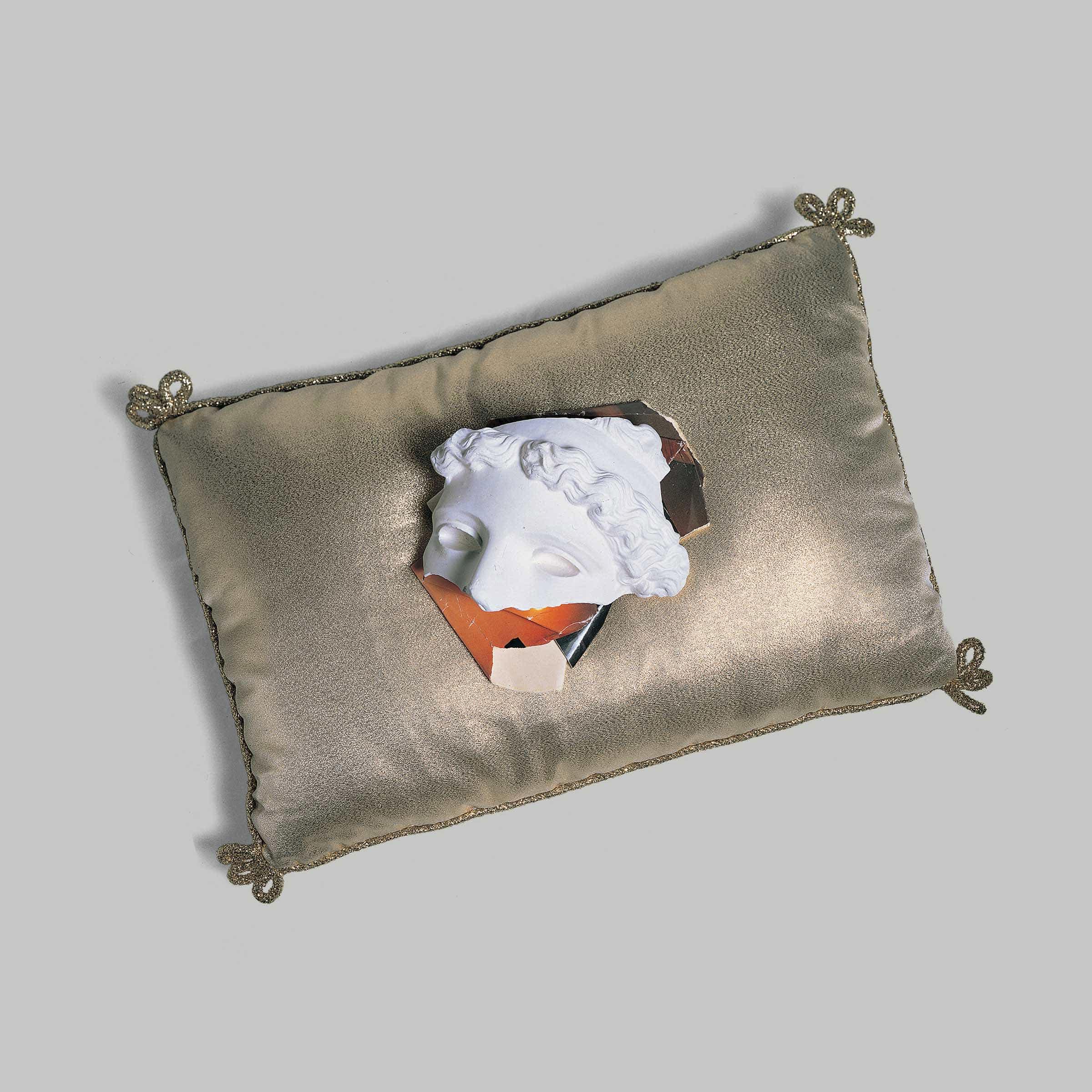 In this second version, the "offer" placed on the pillow is made up of a plaster cast of the head of the Athena Lemnia, broken at the level of the eyes, and a crumpled up colour reproduction of a view of ruins at dusk, which emerges from the hollow of the cast, as if to simulate the missing part of the face.