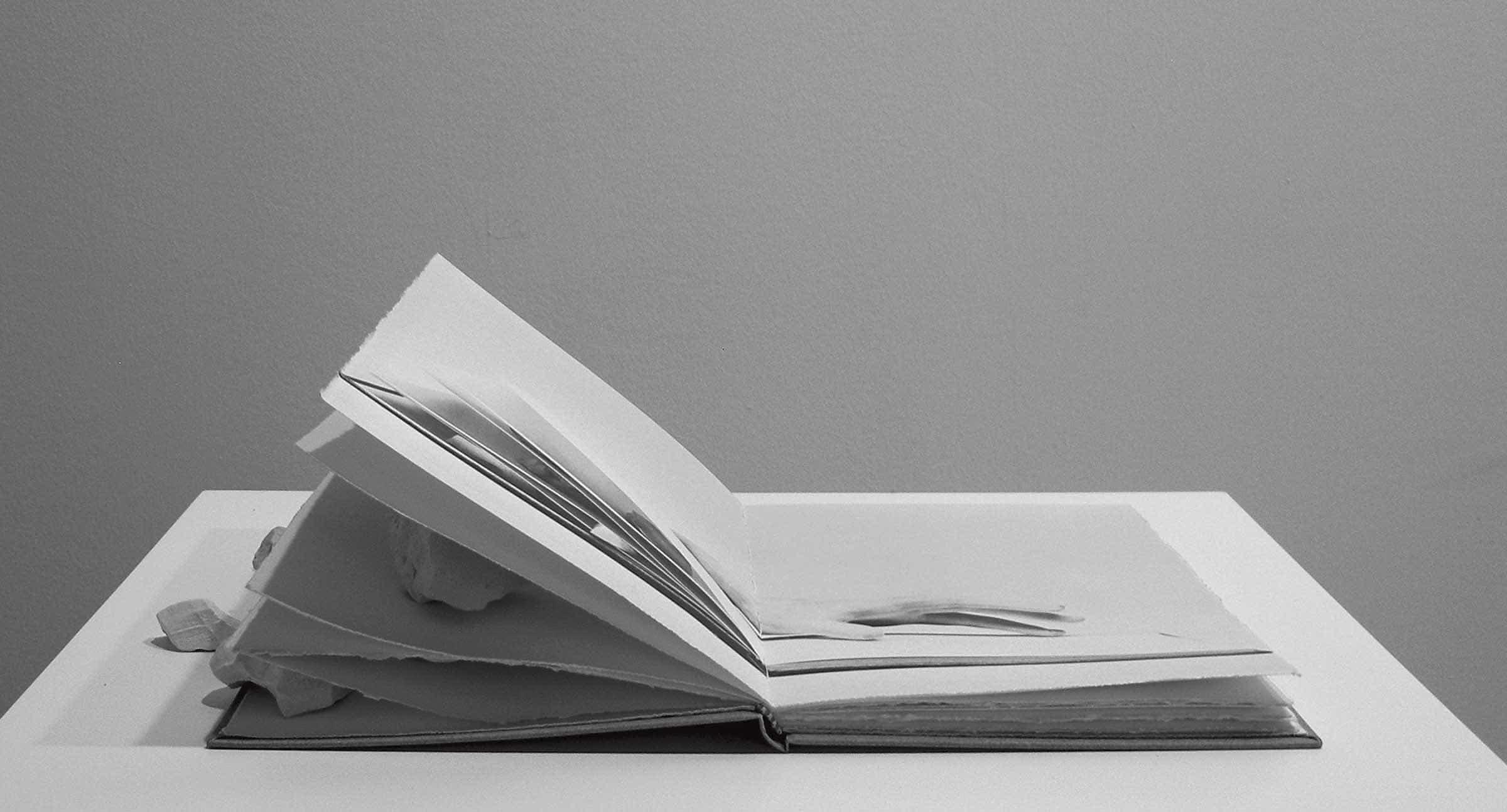 The work is part of a group of four variants from the same year (from GPO-0494 to GPO-0497), whose common denominator is a bound book of blank pages, open each time in a different position; to one quarter in the first case, halfway in the second, three-quarters of the way in the third, and completely open in the fourth. In the point where the book opens a double-page photographic spread presents an image of the book itself open in that position, with the cast of a hand and plaster fragments scattered in between the pages.1