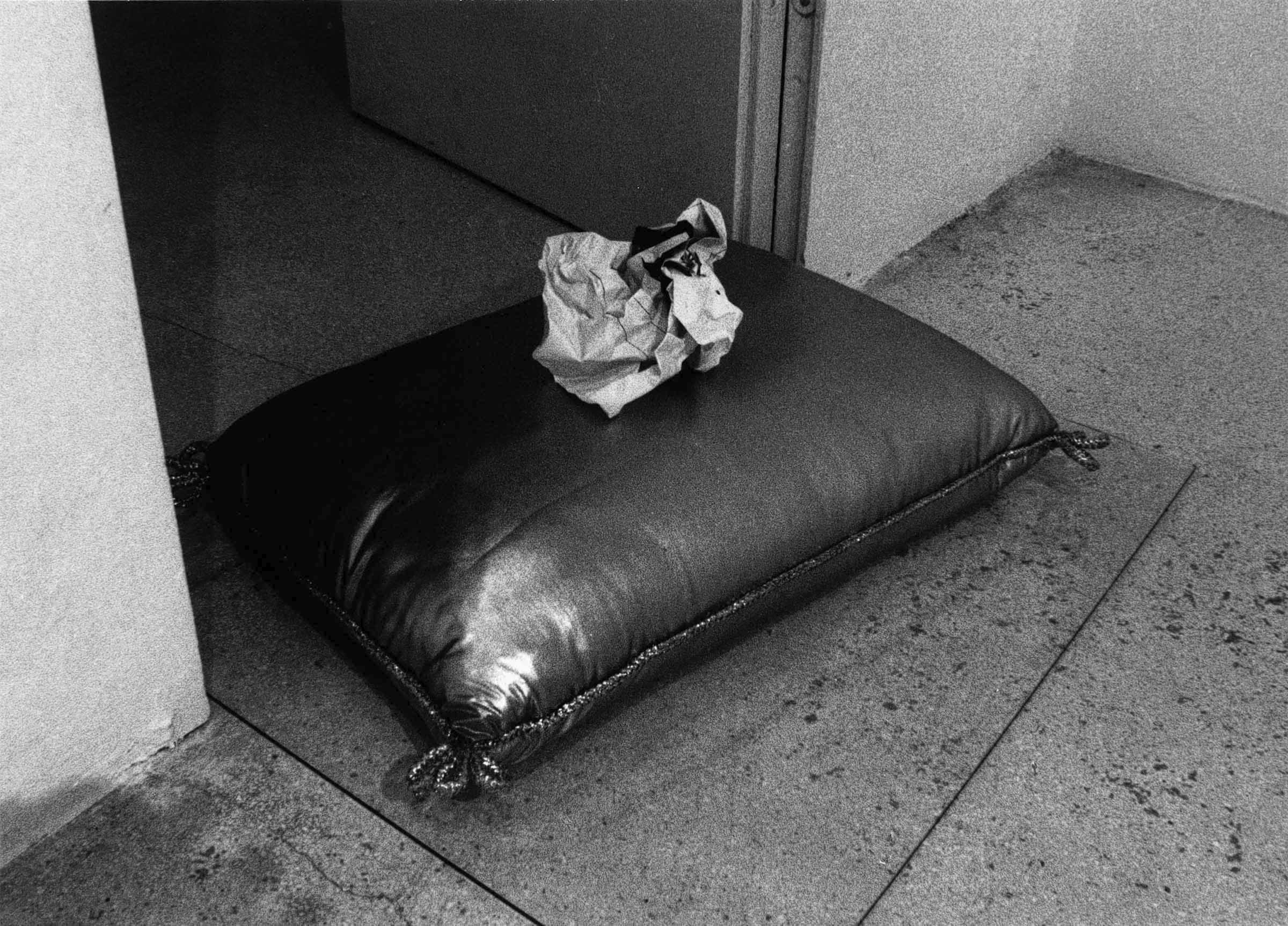 In this variant, made for the solo show in Pescara in 1983, the crumpled up exhibition poster is placed on the pillow. As part of the first presentation, the title referred explicitly to the location of the work at the threshold of the exhibition space.