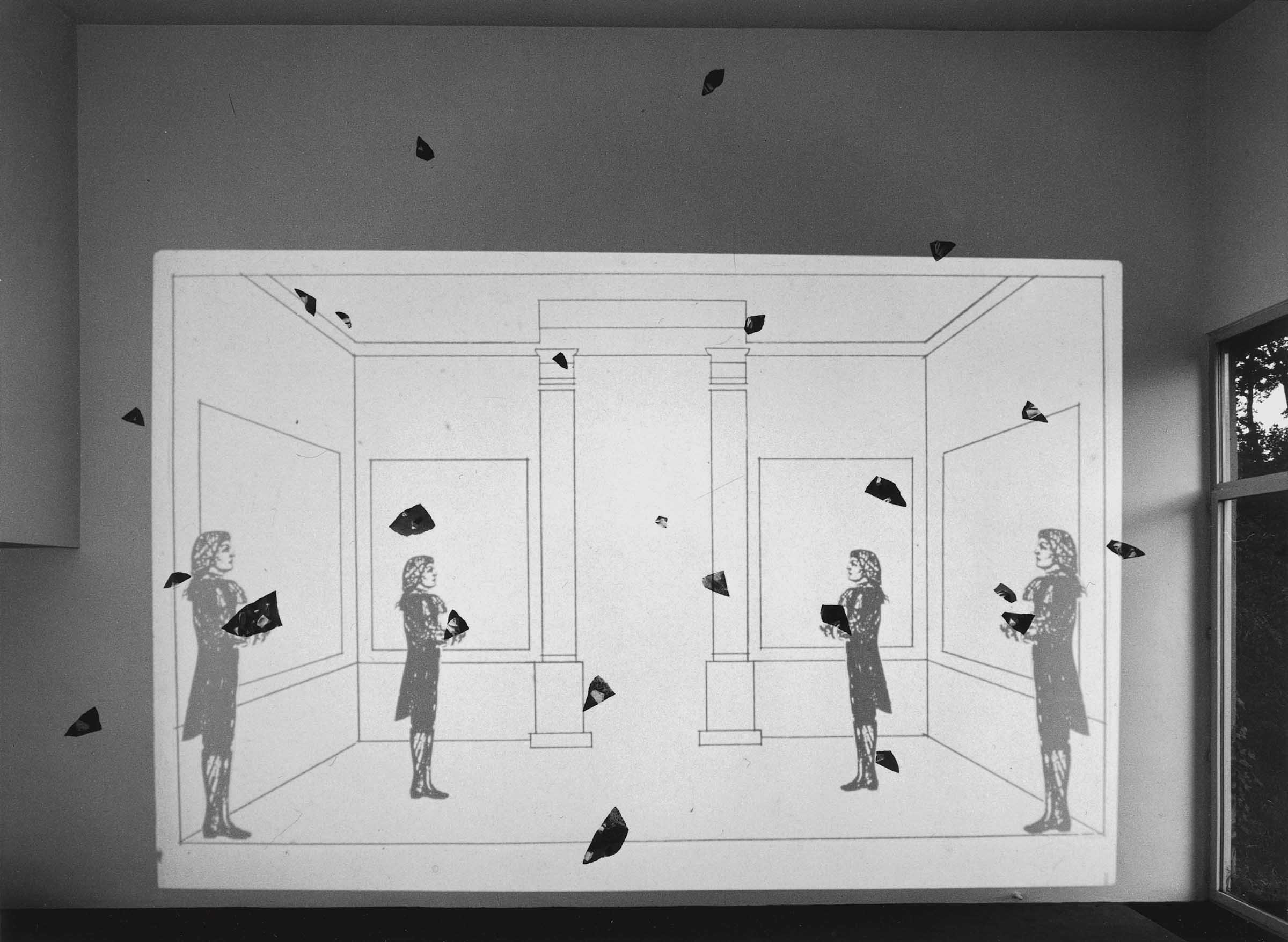 The idea for Trionfo della rappresentazione was conceived in 1983 as a project for a set design, which was never realized.1 Developments from the original idea led to this site-specific work, consisting of a three-part slide projection on three walls of a room, and by a collage of torn fragments of reproductions (taken from posters or exhibition catalogues of the artist's work), applied to the wall in correspondence with the luminous images.2 The projections present the silhouettes of nine figures wearing livery (the images are of two, three, or four valets), represented in the gesture of holding something in front of themselves and part of the perspectival drawing of a room. The fragments scattered on the wall at times seem to be offered by the valets, at other times are suspended in the void to evoke appearances and disappearances in the "theatre of representation".