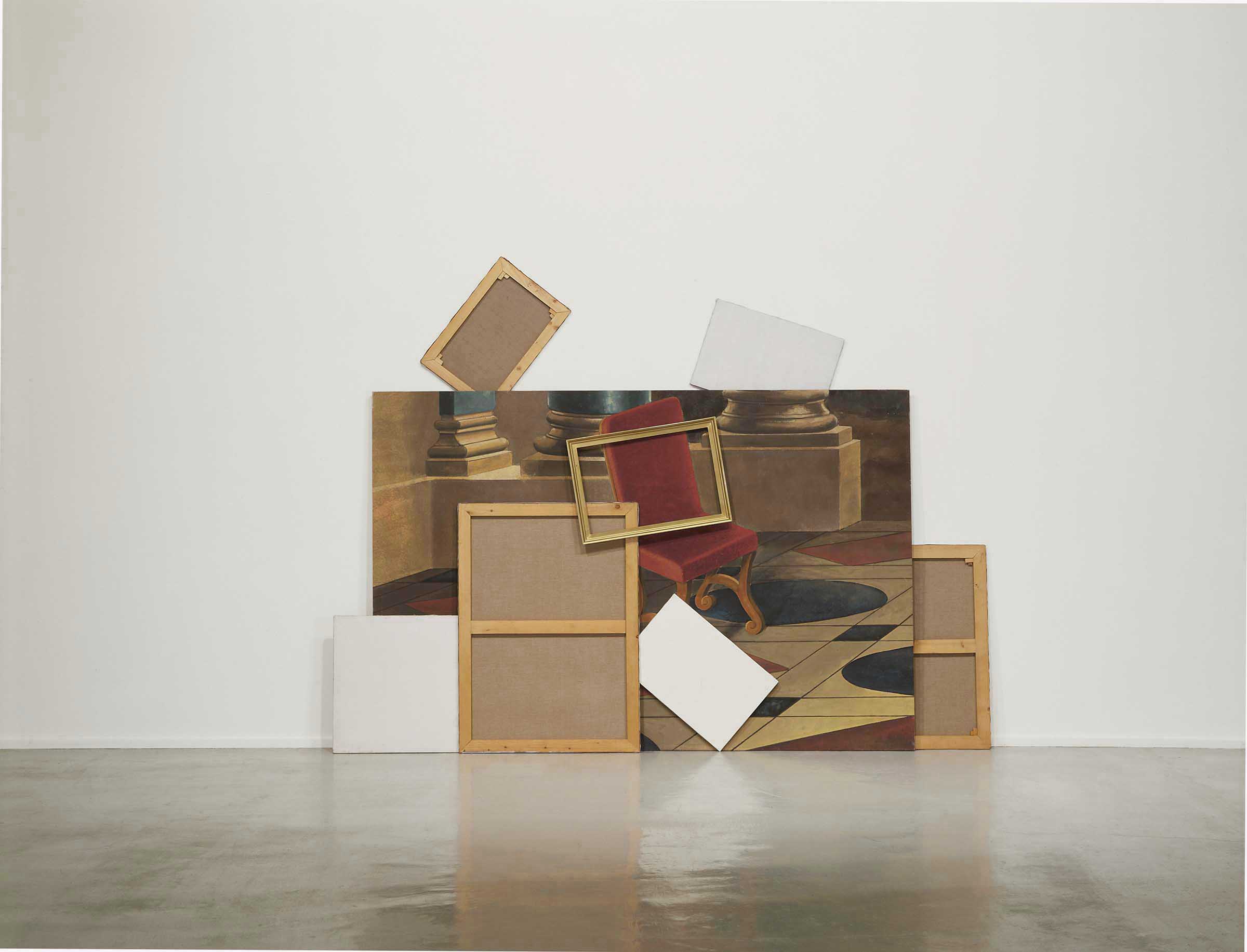 Mnemosine (Les Charmes de la Vie) is the general title of a cycle of works, initially designed to contain nine episodes (an analogy with the number of letters contained in the name Mnemosyne, mother of the nine Muses), but in the end condensed into just six parts (GPO-0460, GPO-0504, GPO-0511, GPO-0599, GPO-0621, GPO-0677). A common denominator is the presence of one or more paintings, reproducing the details of Jean-Antoine Watteau's painting entitled Les Charmes de la Vie (1717-18). The canvases, commissioned by Paolini from a scenic painter, comprise the division into nine equal parts of an enlarged copy of the eighteenth-century painting, absent the figures that originally filled it. From one work to the other, the artist associated to the details of the painting a corresponding number of objects: for instance, he added two elements to the second detail, seven elements to the seventh detail, and so on and so forth. From one station to another, the principal elements making up the spatiality of Watteau's painting – sky, chair, columns, floor – are staged in echoes and amplifications, in declaredly theatrical terms in harmony with the register used by the French painter.
