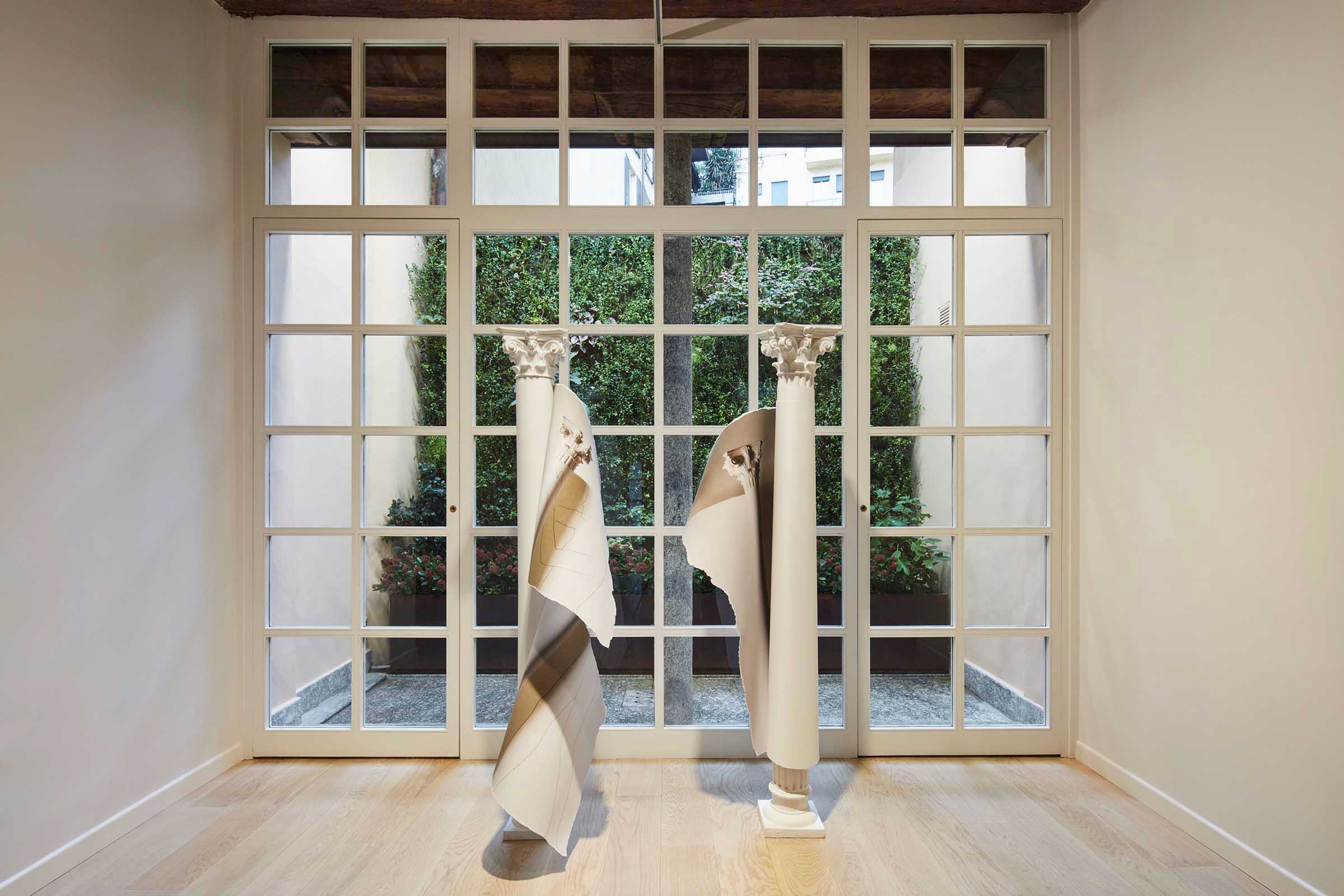 The plaster casts of two Corinthian columns bear the two torn parts of the photograph of a previous variant of Cariatide (1979, GPO-0418). In that variant, on the contrary, a sheet of paper was stretched between two columns so that the figure drawn on the sheet would appear to be complete in its profile (the figure found its arm, outlined on one extremity of the sheet, only when that latter was correctly stretched between the two columns).