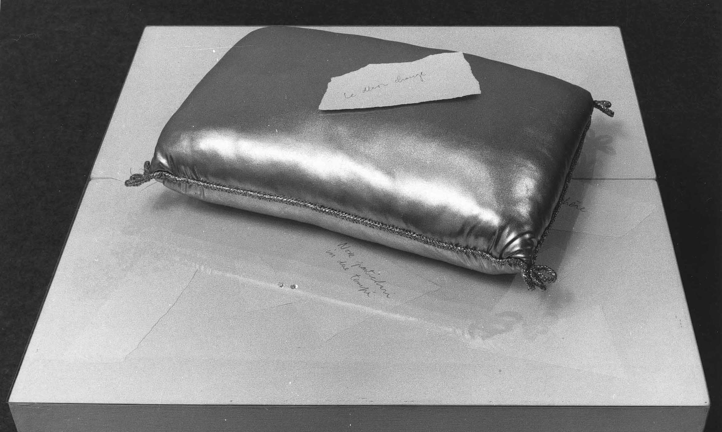 In this seventh variant the golden pillow is arranged so that it relates to the occasion for display in which it is presented, so that each time it has a new configuration. In the first exhibition of the work in Bologna in 1984 the artist placed on the pillow a fragment of paper that referred to the title of the work itself (“Le décor change”) and at the same time announced a possible "change of scene", while around the pillow other fragments of paper bore the title of the four works on display. In the 1990 installation, instead, a large rock held on the pillow several typescript sheets with the titles of the other works on display, while scattered underneath the pillow and on the ground were several site plans of the exhibition area.