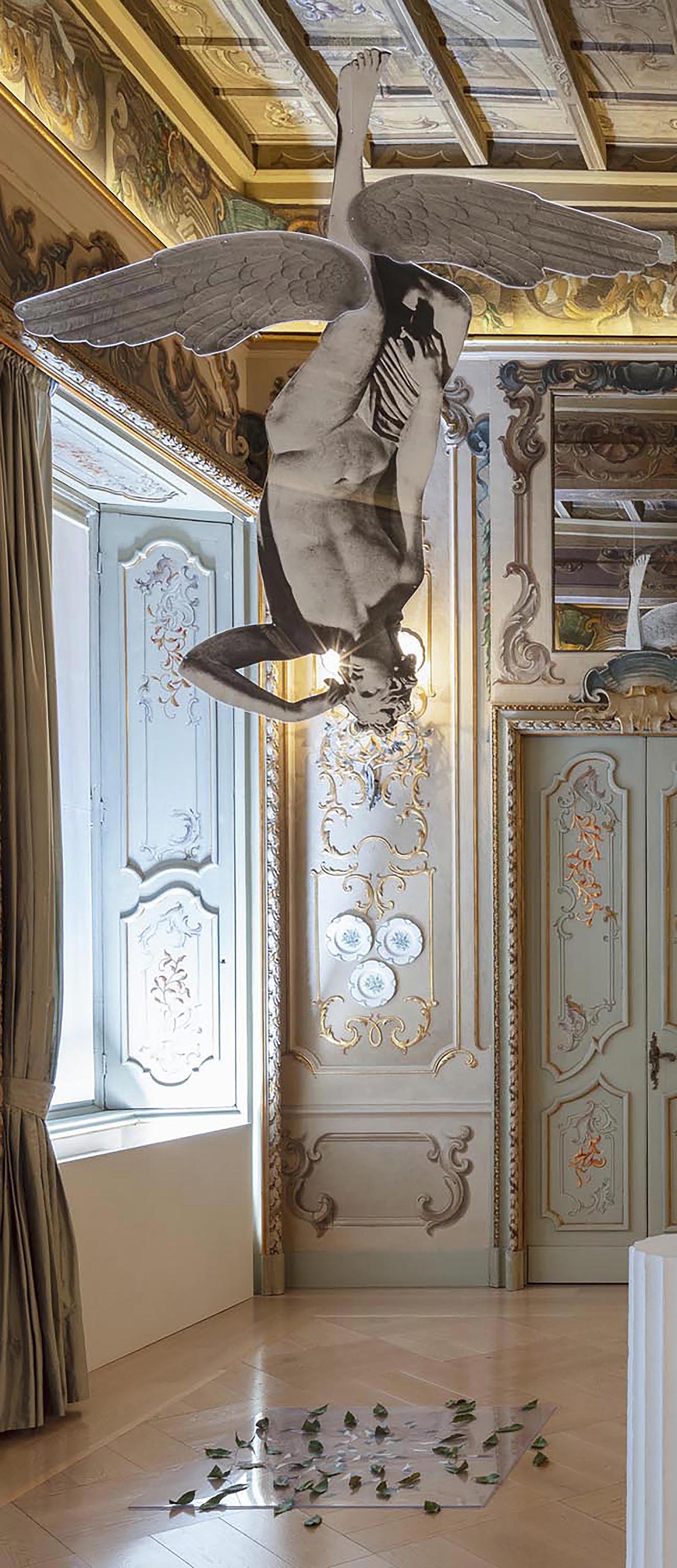 A winged figure made up of a photographic collage with pieces from the reproductions of works by Antonio Canova – mounted between two plexiglas shapes hanging down from the ceiling on a steel cable – wavers in mid-air in an upside-down position. On the ground a plexiglas sheet holds down some photographic details of other works by the artist cut out in the shape of a leaf, while scattered on top of the sheet and all around it are laurel leaves.