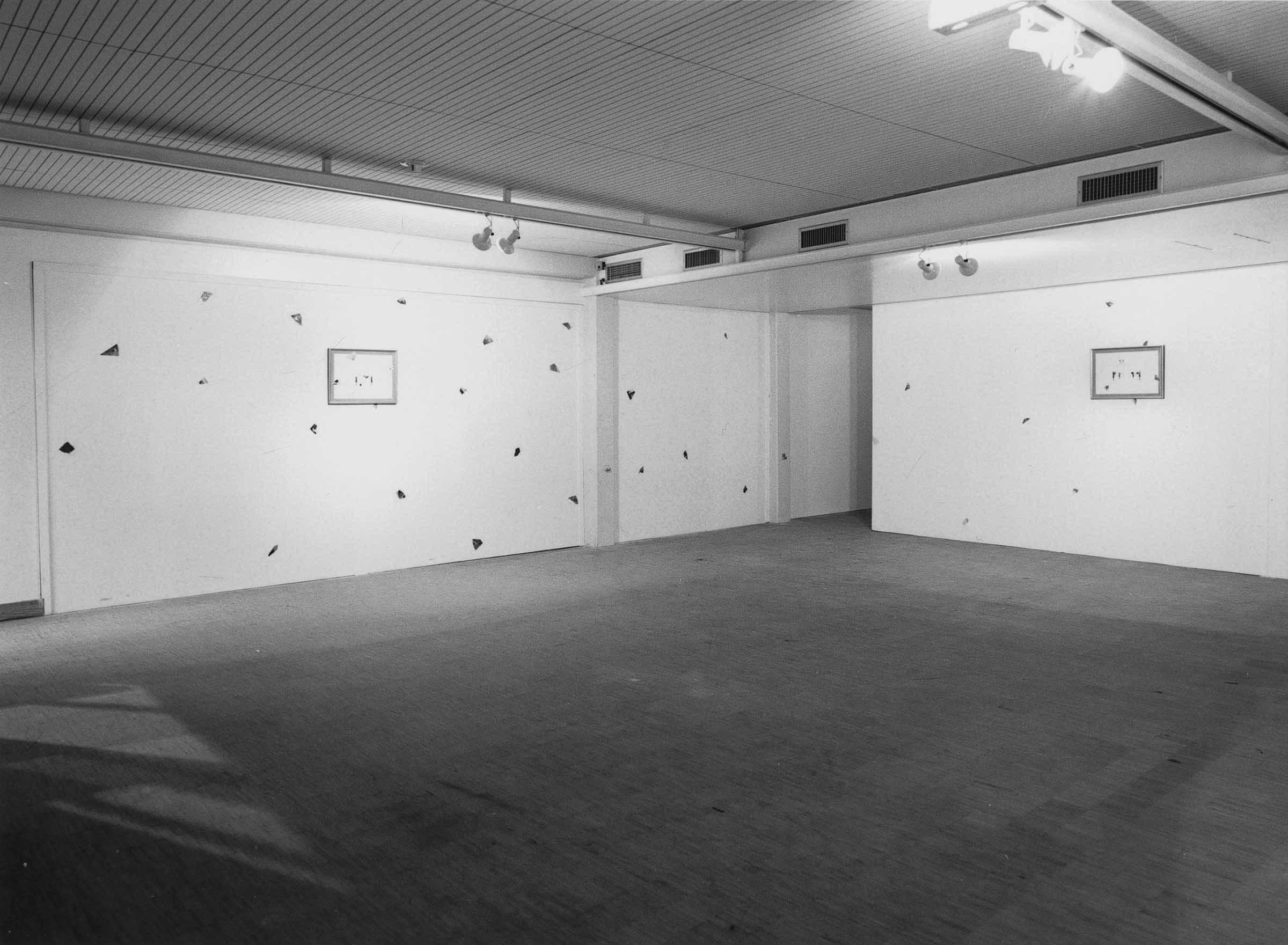 The three framed collages each arranged at the centre of a wall feature the silhouettes of nine figures wearing livery, depicted in the gesture of holding something before them and inscribed in the perspectival drawing of a room. A multitude of torn fragments – taken from the catalogue of the exhibition for which the work was made – are scattered on the glass of the frames and all around on the three walls of the display space.