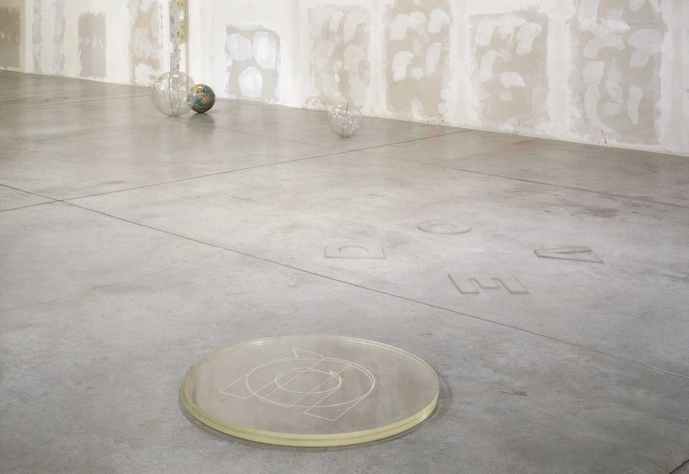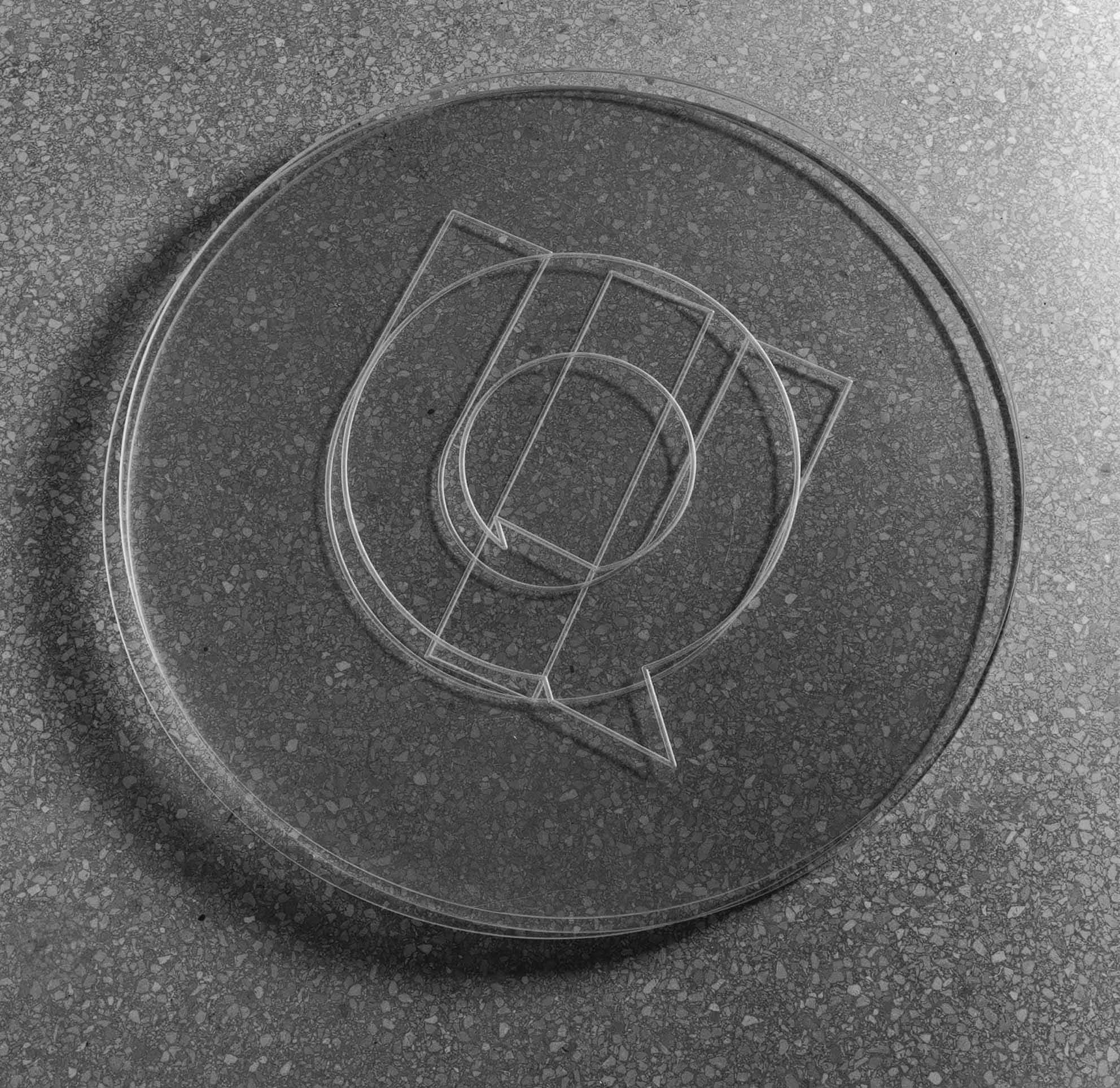 Three round plexiglas elements placed one on top of the other, and slightly staggered, bear the letters “Q”, “U”, and “I”, respectively, so as to form the word “Qui” [Here].