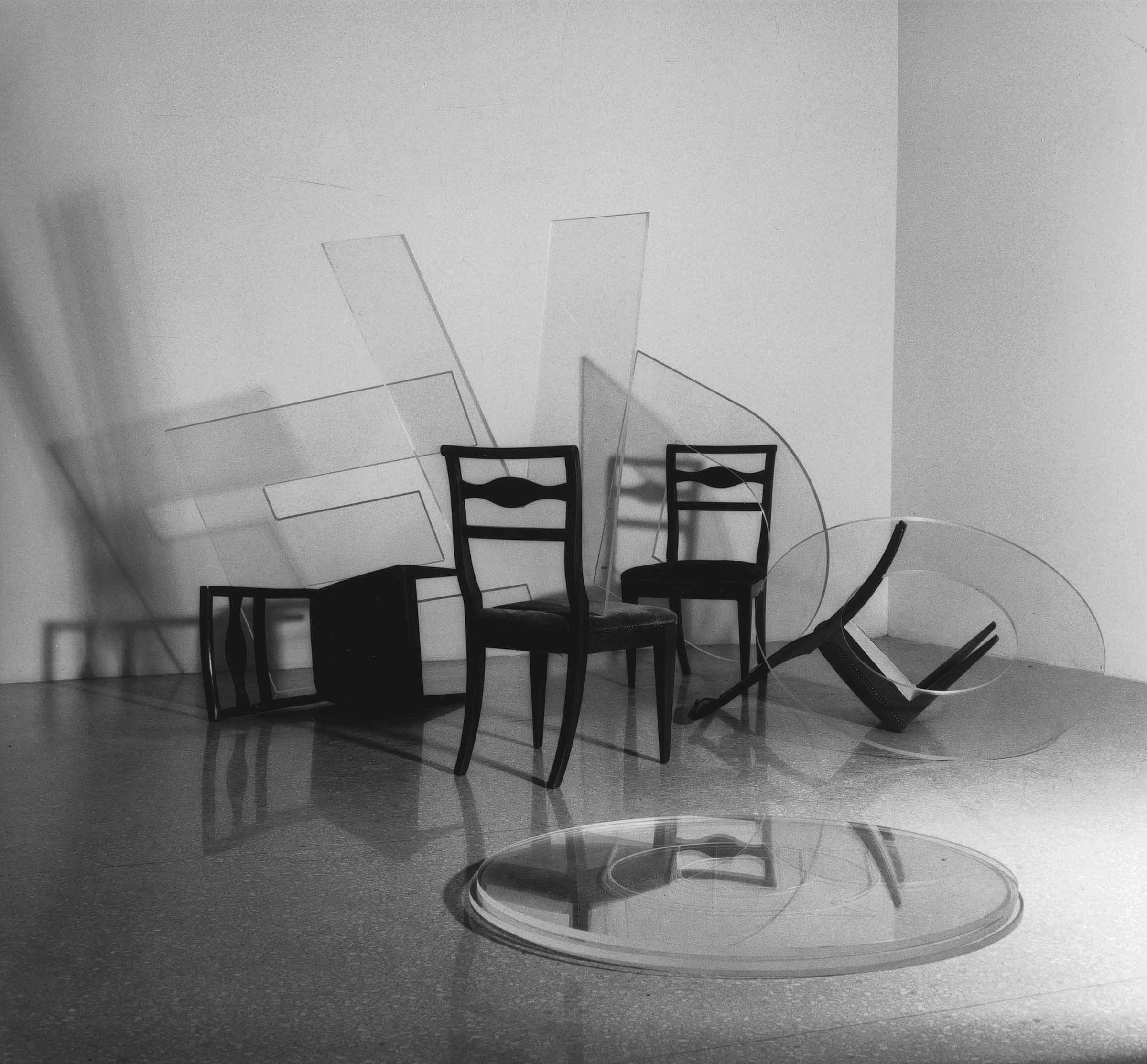 In 1990 in Bologna he related the four elements to the same number of chairs arranged in a circle and in part turned upside down on the ground.