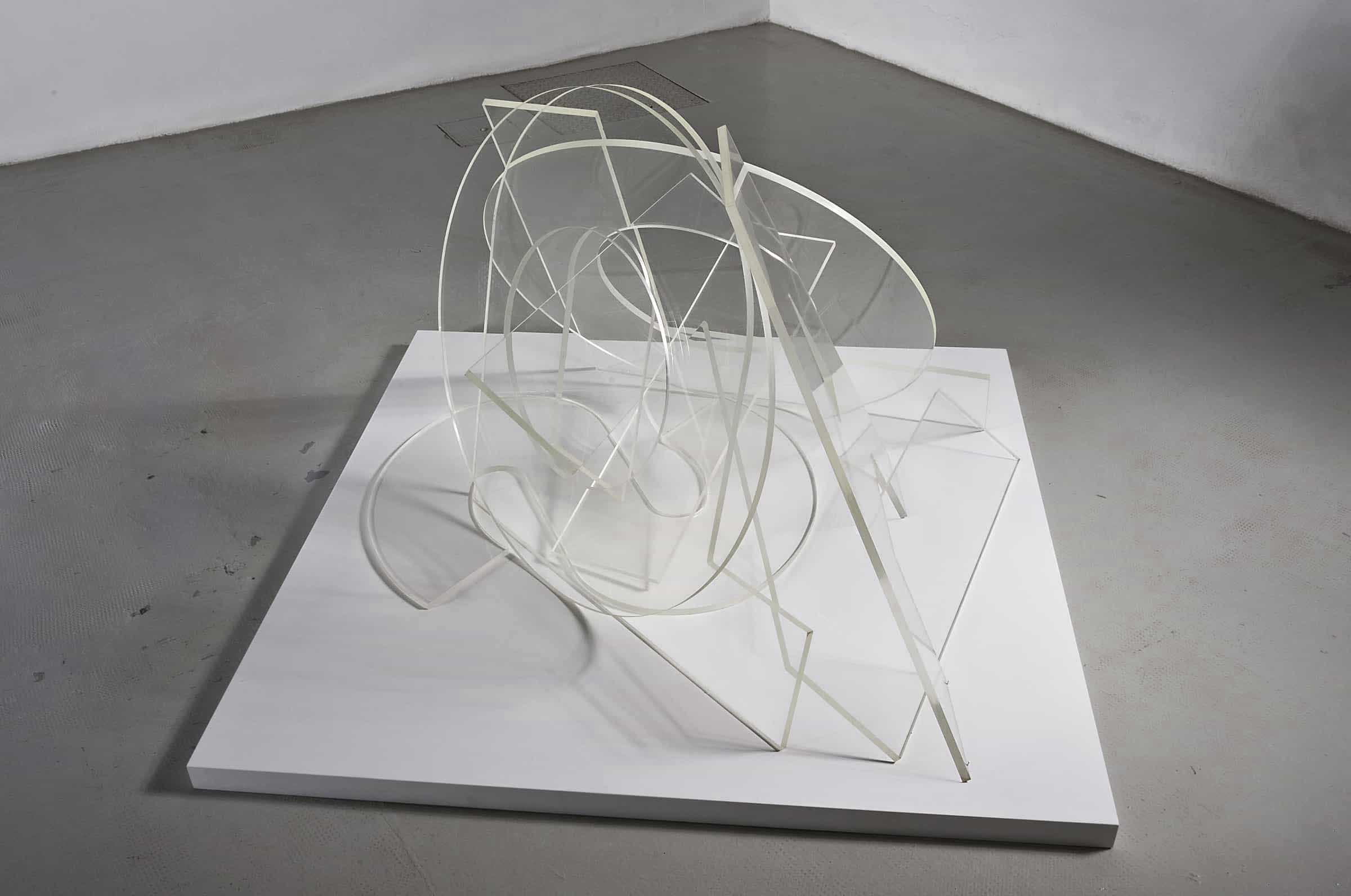 Eight plexiglas shapes, reproducing the letters that make up the words referred to in the title ("Lo spazio” means “Space”), are arranged one on top of the other so that they interlock in a complex way, which causes the word to implode in an undecipherable tangle.