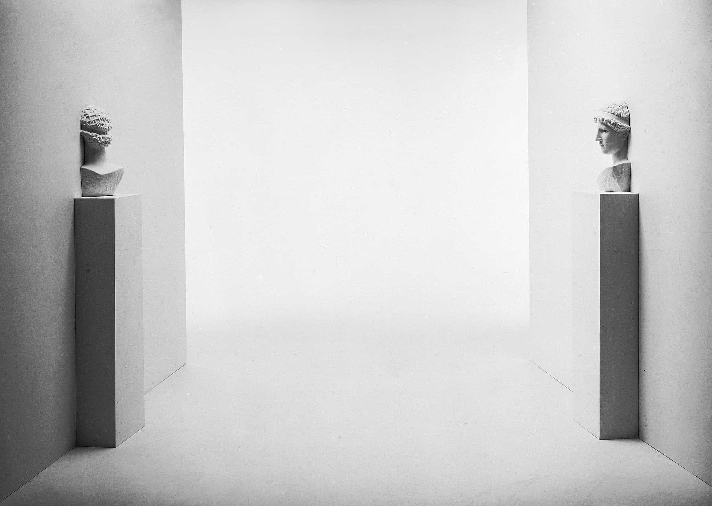 The two halves of the plaster cast of the torso of the Athena Lemnia, each of which set down on a plinth, are situated one before the other, up close to two opposite walls.