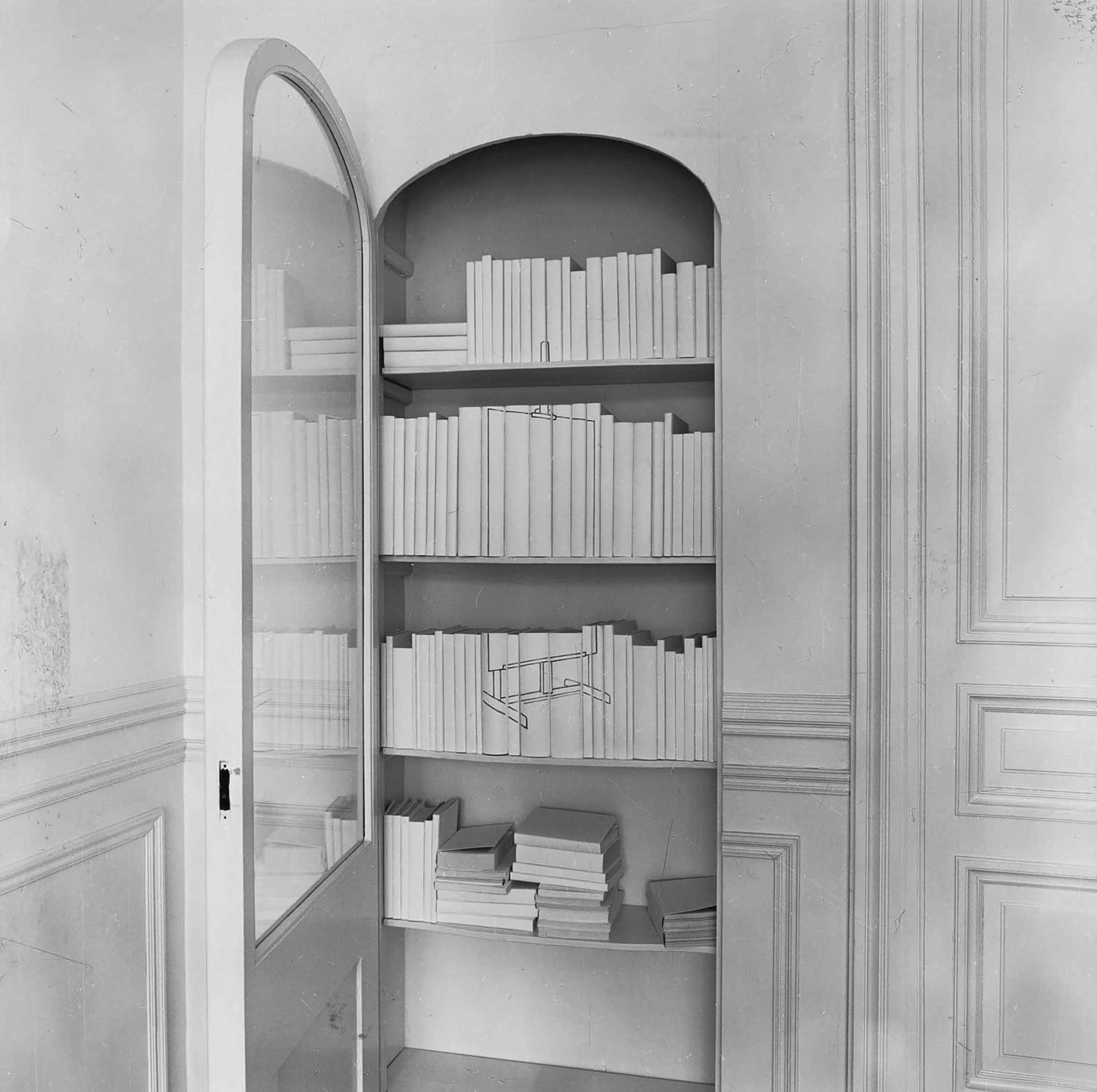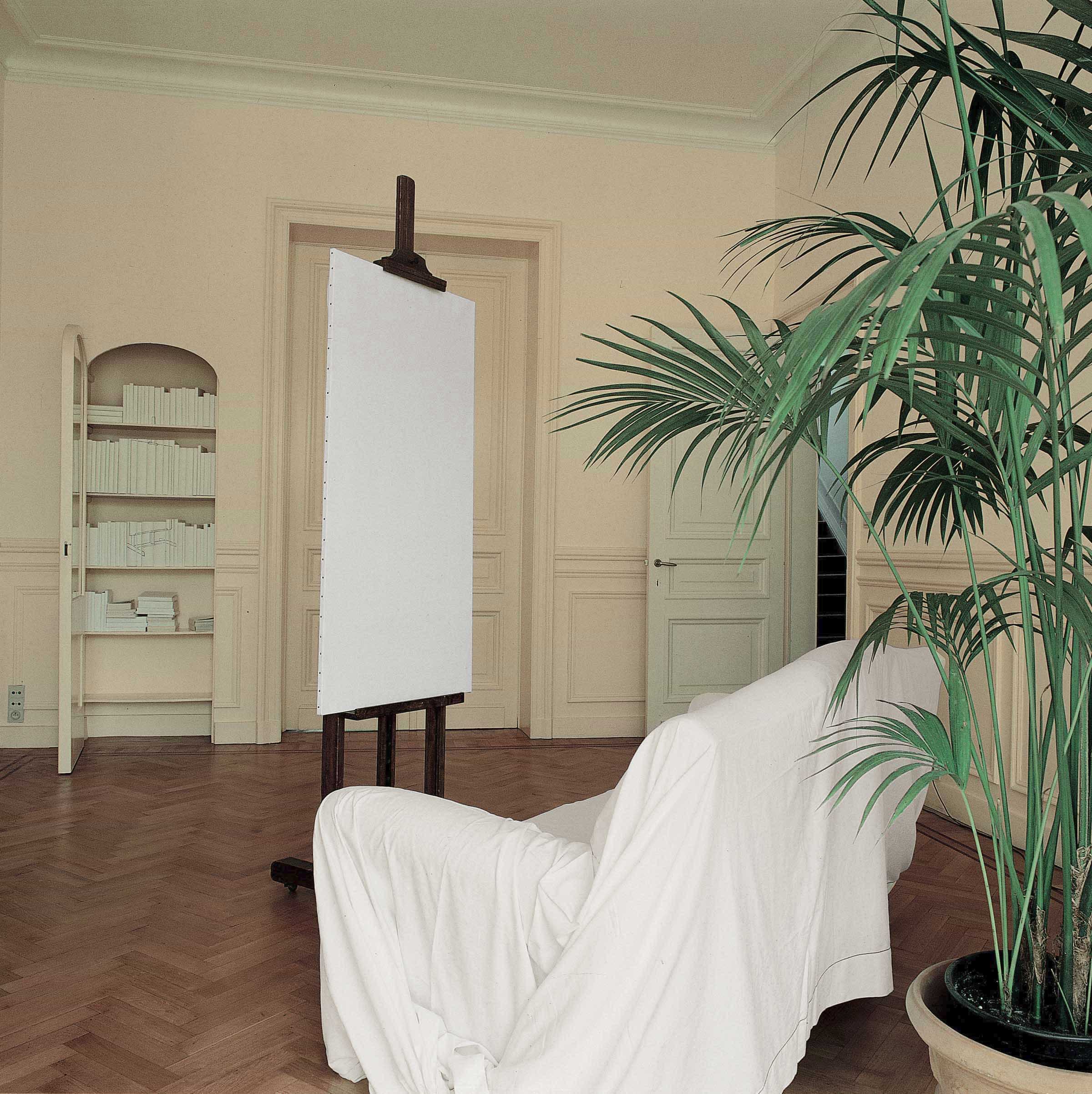 In the guest room of a private home in Ghent, made available for the group exhibition “Chambres d’amis”, Paolini placed a primed canvas on an easel at the intersection of the diagonals of the room, facing a sofa that was turned towards the bookcase on one side of the room. Afterwards, in a reduced perspectival drawing, he drew the image of the canvas and the easel on the spine of the books covered with white paper and arranged in the bookcase, so that the drawing mirrored the point of view of a hypothetical guest seated on the sofa.