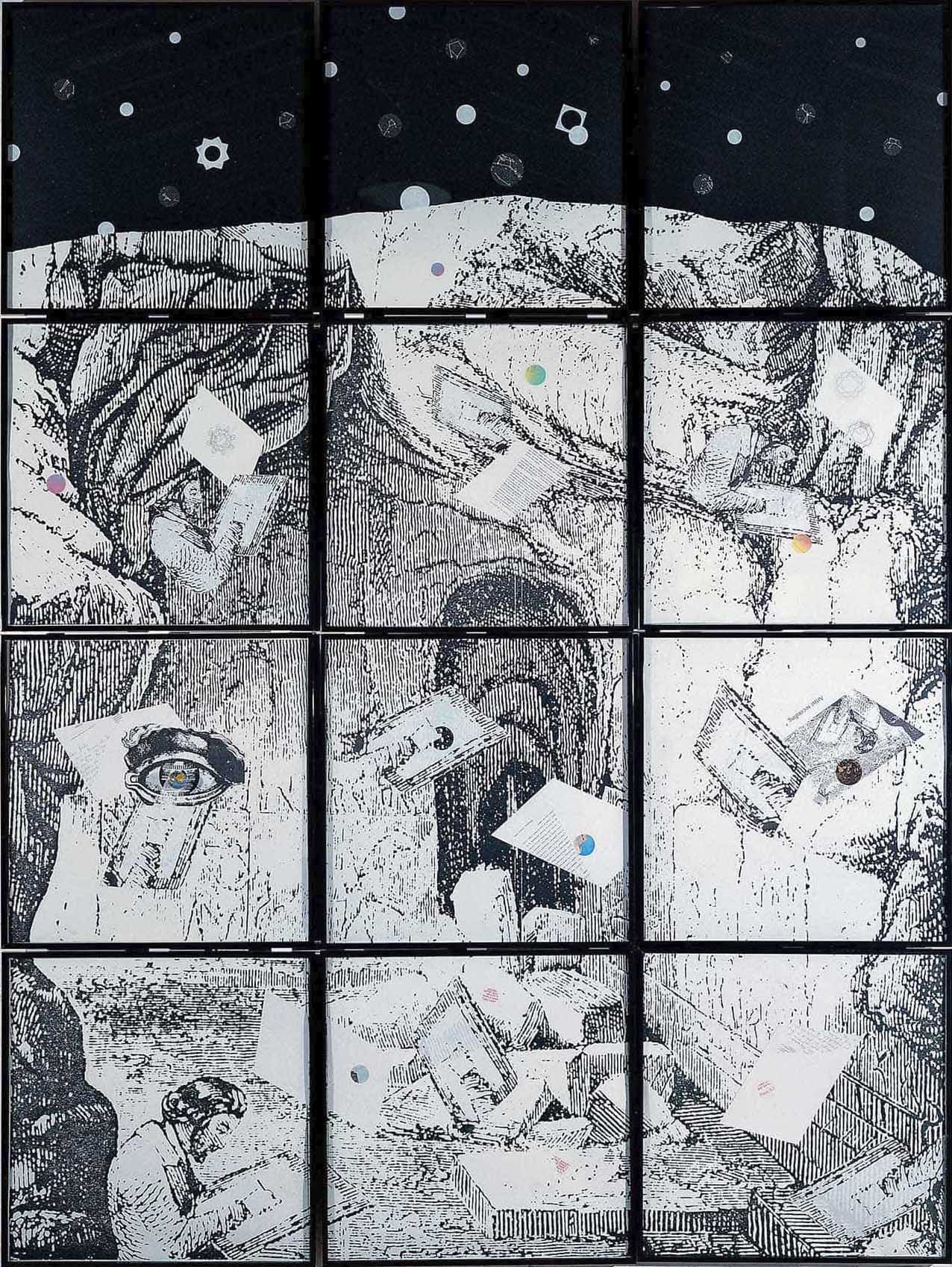 Twelve framed elements placed at short intervals to form a large painting reproduce an engraving portraying a draughtsman in a landscape with ruins.1 The artist turned the nineteenth-century image into the image of a face seen from the side, adding an eye2 and hiding the upper part with a strip of black paper to emphasize the shape of the hypothetical head. Each of the twelve elements is made up of a collage consisting of: 1) a detail of the draughtsman of ruins, each time rotated and included in a spiral path that converges in the cavern-ear, 2) a small circular fragment of a colour reproduction of the solar system, 3) one or two torn fragments of the answer given to the artist by nine friends, when asked to express a suggestion as concerns "all that is beautiful in Italy".3 The element with the eye also bears a tiny metal globe in the area of the pupil, applied to the glass. At the top, the black paper background is studded with celestial bodies represented by small elements of white and silver paper.