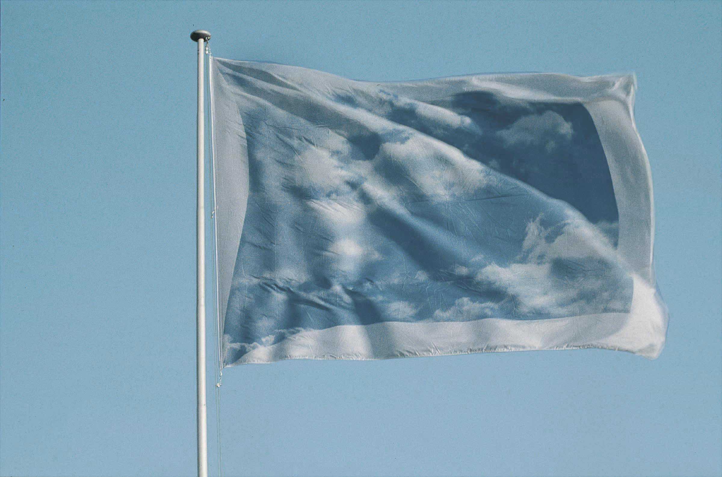 The image on the flag is that of another waving flag representing a cloudy sky. The absence of a figure is emphasized by the white edges, which become the absolute "figure" of this empty flag or flag with a "hole", devoid of a figure, as the title tells us.