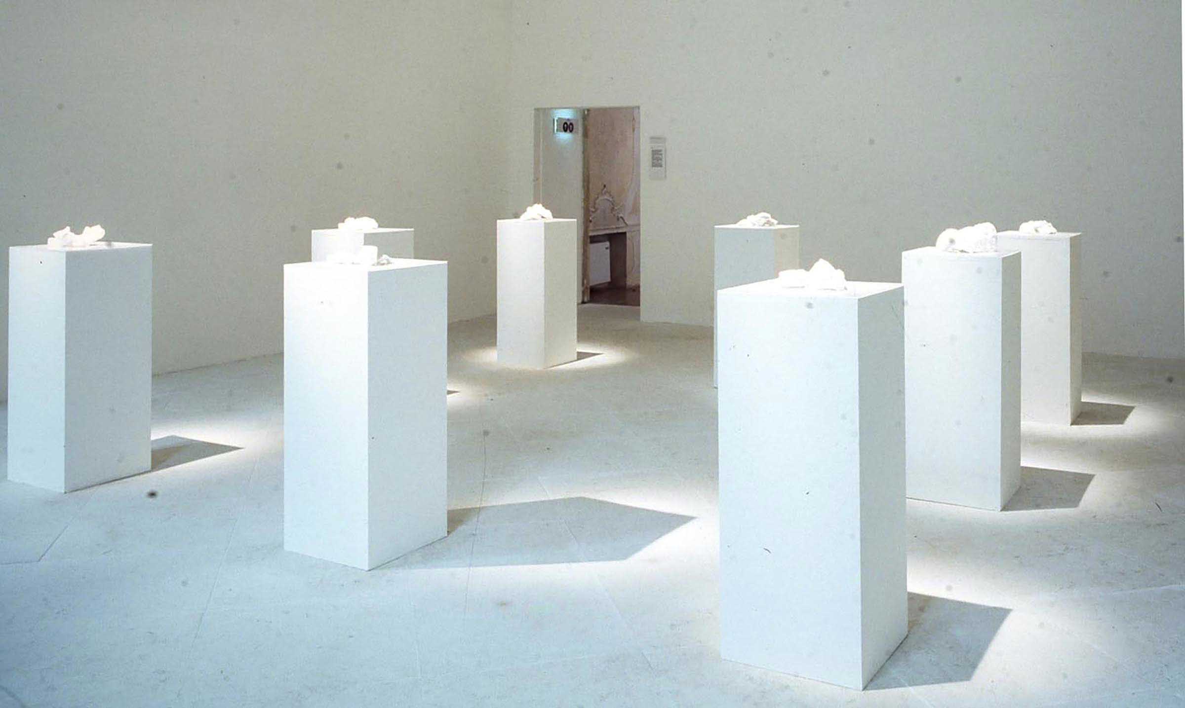 Plaster cast fragments, shaped photo prints, glass sheets, white plinths