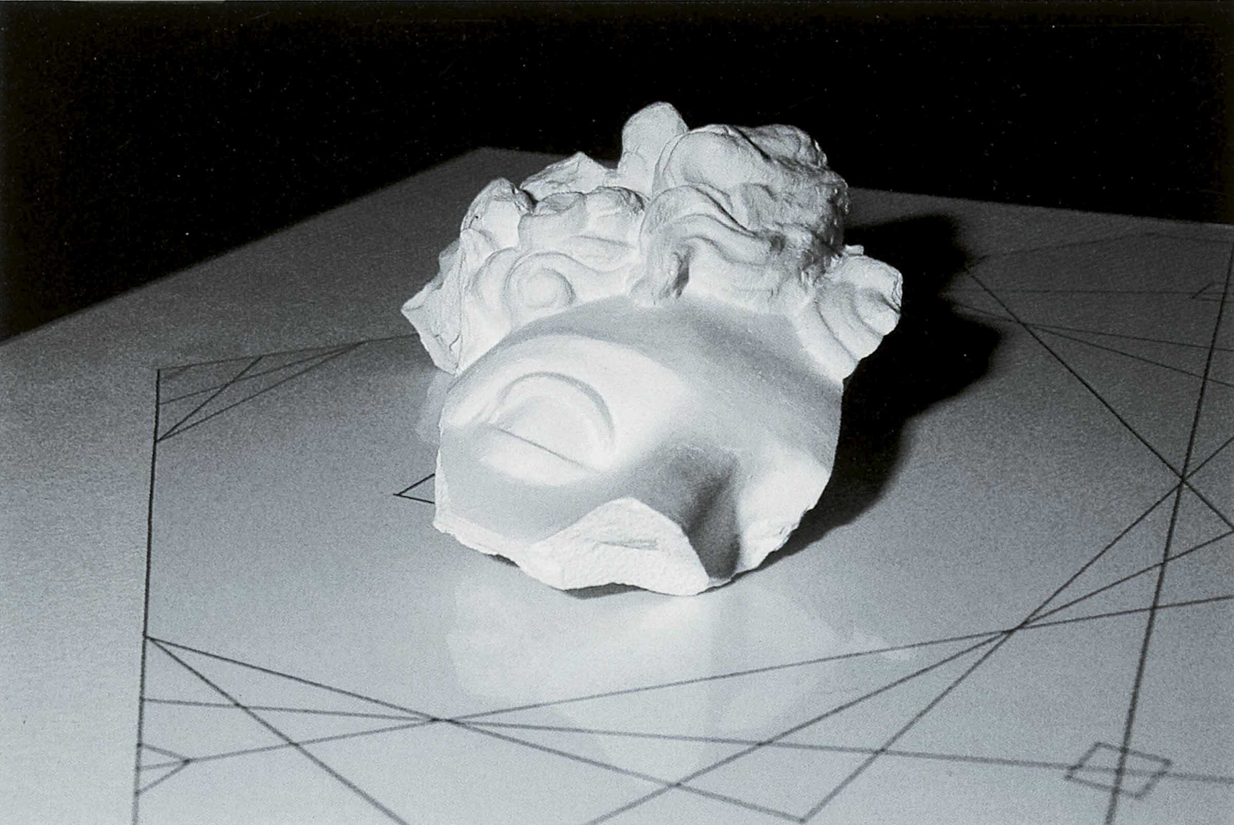 On each of the plinths, positioned at regular intervals along the sides of the display space, a photograph of the room plan reproduces the arrangement of the same plinths, as it does a plot of straight lines that determine the cone of vision of the viewer’s gaze from the four corners of the space and from each plinth towards the centre. The drawings are shaped so that each time the viewer is shown the portion of his or her visual field corresponding to that point of view. On the photographs held down by a glass sheet, the plaster cast fragments of a head of Apollo indicate that a complete view is impossible, underscoring the partiality of each point of view that always and only perceives a single detail of the whole.