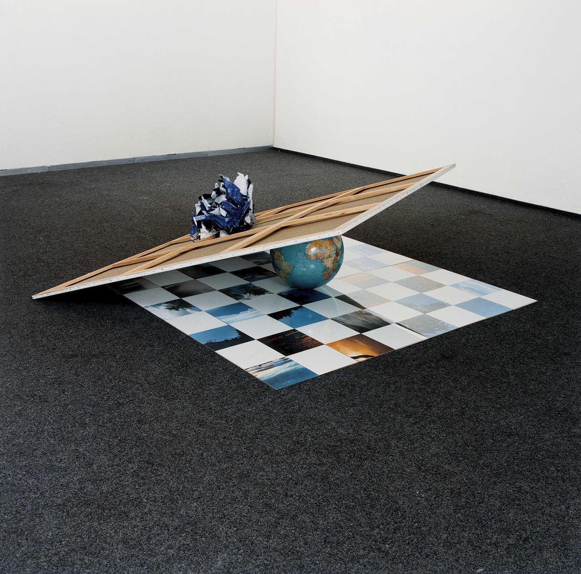 A large upside-down canvas, surmounted by a crumpled star chart, teeters atop a globe placed at the centre of a chessboard that is the same size as the canvas, arranged on the ground by means of sixty-four square units held down by four plexiglas sheets placed close together. The white units consist of blank pieces of card stock, while the photographic ones are views of the sky (clear, cloudy, in the colours of the dawn and the dusk, with or without details of the landscape).