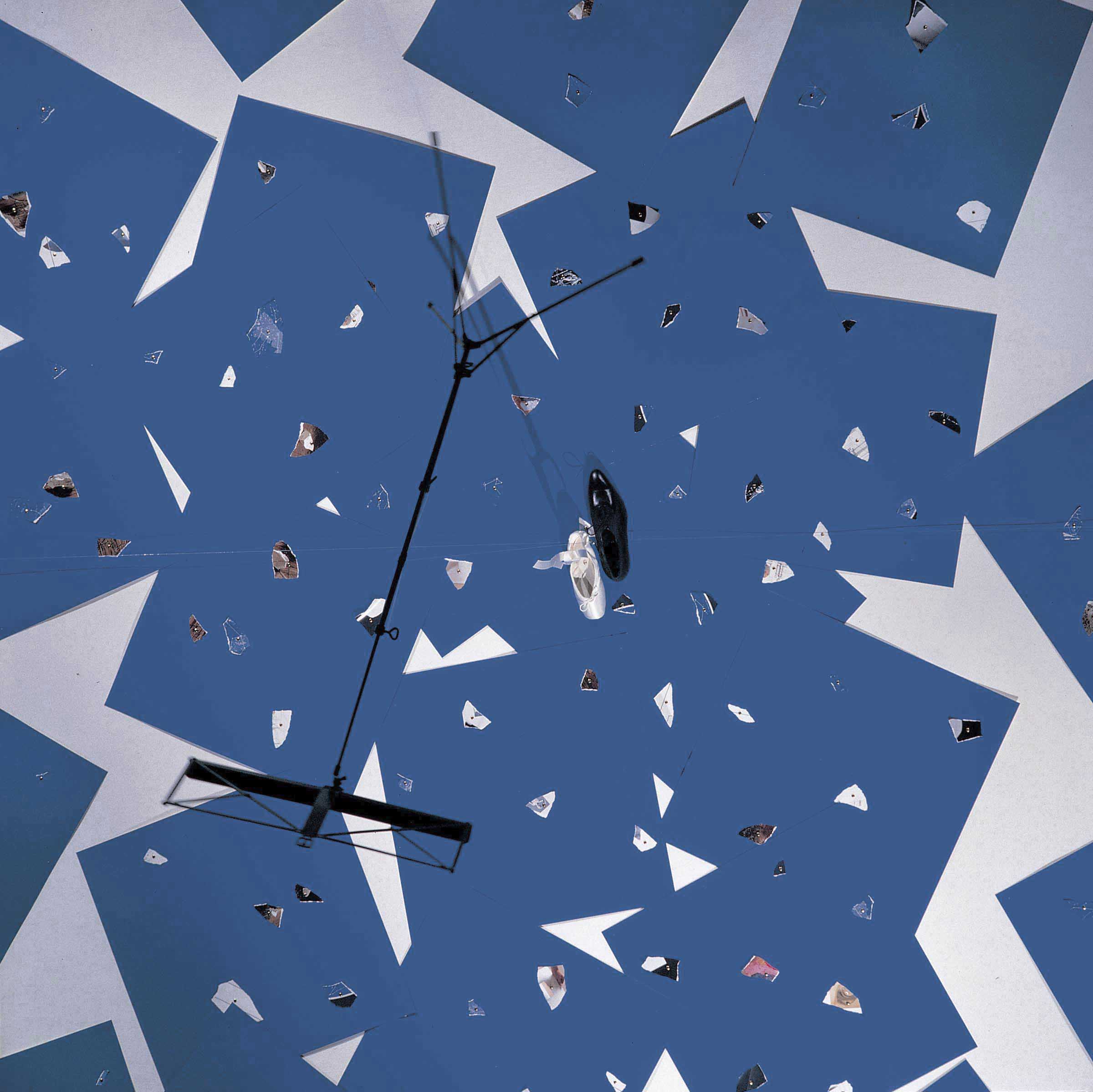 A multitude of bright blue pieces of cardstock, studded with golden clips that hold small fragments of reproductions of stellar cards and of previous works by the artist, are scattered across the ceiling to simulate the view of the firmament. Towards the outer part of the visual field they gradually thin out, and at the two ends of the area they are reduced to a format that complies with the perspectival view; the cards along the edges are trimmed as well, in order to suggest a hypothetical continuum. At the centre, a nylon thread fastened to the ceiling between a black men's shoe and a white ballerina's scarf – arranged so that they point in opposite directions – holds a music stand hanging in the void.