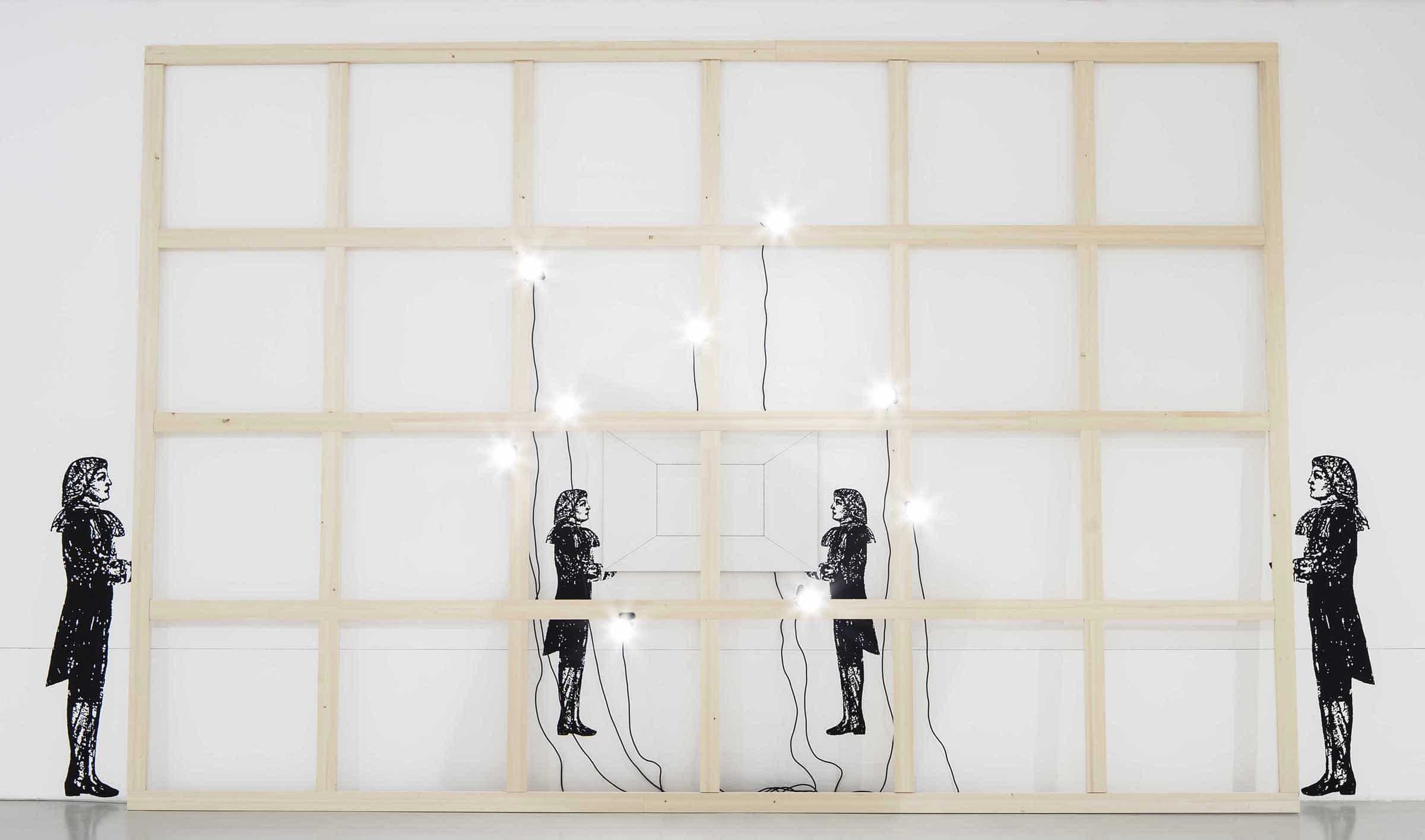 Two pairs of life-size valets painted in tempera are contained in the perspectival drawing of a room outlined on the wall. The valets in the foreground "hold" a large stretcher, that is propped up against the wall. Attached to it are nine lit spotlights arranged at random, turned towards the viewer. The valets located in the background instead present a primed canvas hanging on the wall, which reiterates the perspectival drawing of a room.