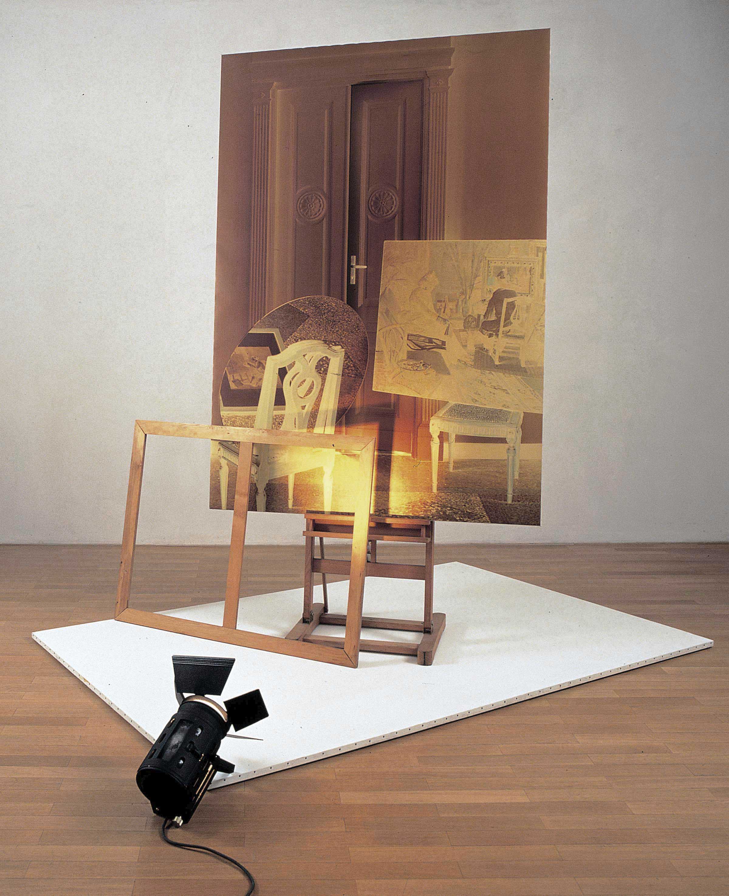 A colour photograph mounted on canvas, printed in its negative version and featuring reddish-brown toning, is set down on an easel, which is located at the intersection between the diagonals of a primed canvases lying on the floor. A stretcher leans up against the easel, while a spotlight placed in the corner of the canvas on the ground illuminates the assemblage of elements. The photograph reproduces a situation that was installed by the artist in the atrium of his own home, opposite a door that had been left ajar, with two chairs turned so that one faced the viewer and the other was specular. Standing on the chair to the left was the painting by Angelo Garino Nota intima (1887), while the chair to the left held an oval mirror that reflected the engraving, set down on the floor out of view, that portrayed William Hogarth while painting the Comic Muse.1