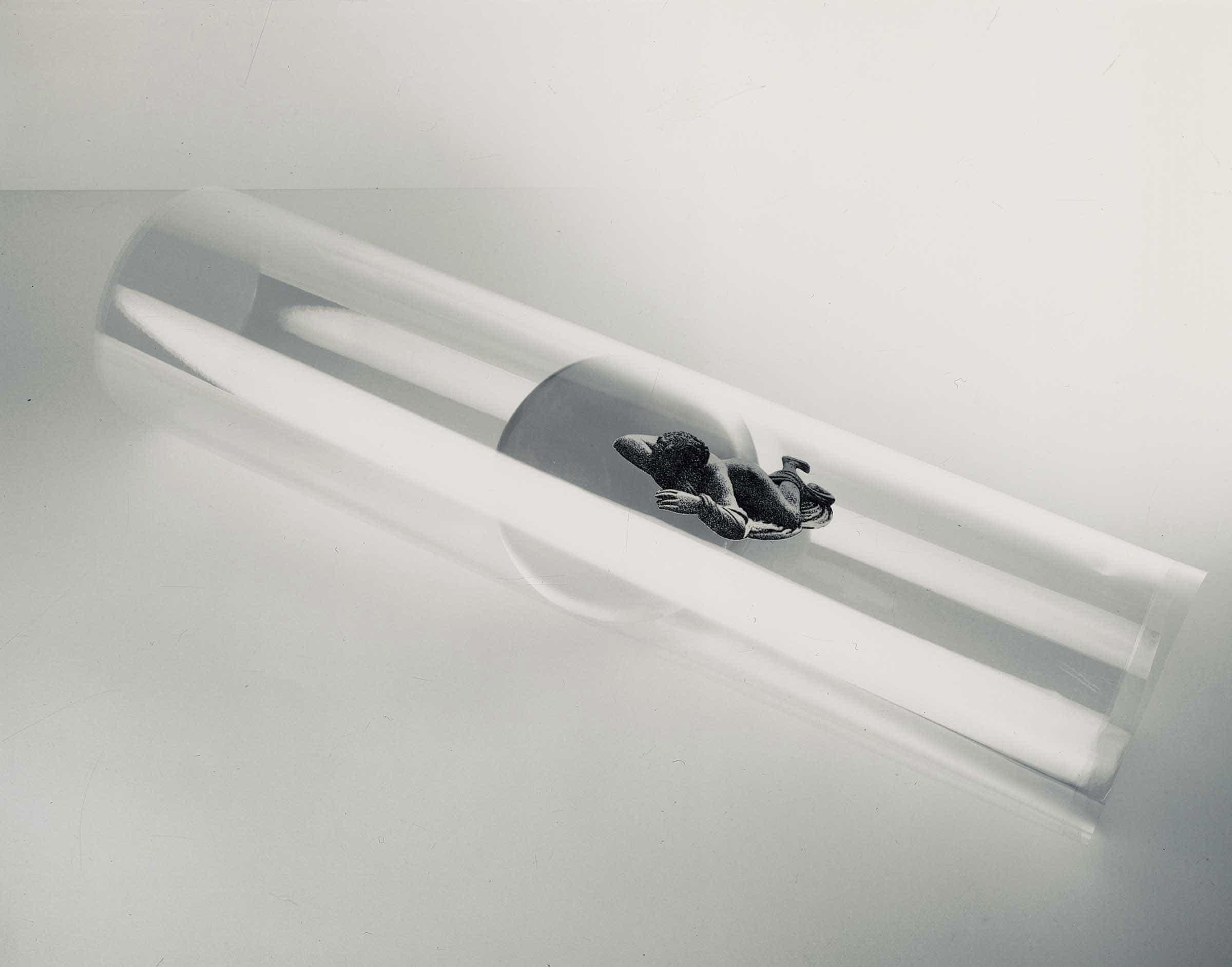 The cut-out image of the Sleeping Hermaphrodite (3rd c. AD) is inserted in the outer roll of a sheet of transparent acetate rolled in the manner of a scroll around a crystal ball, so that the figure seems to be focused on contemplating the ball.
