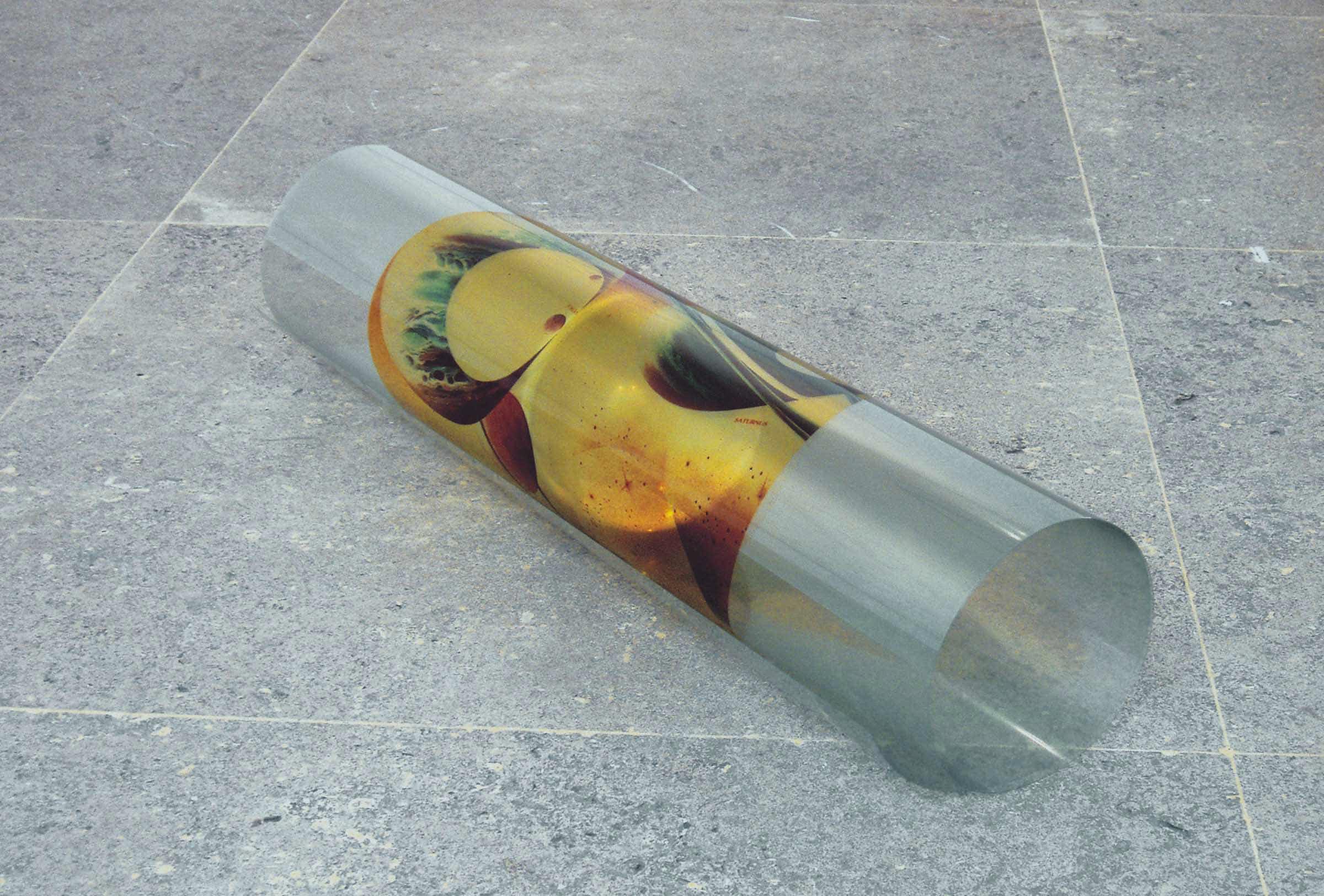 A sheet of transparent acetate featuring the impression at the centre of the colour image of a circular ensemble of planets is rolled in the manner of a scroll around a crystal ball, thus suggesting kaleidoscopic correspondence between the various spheres.