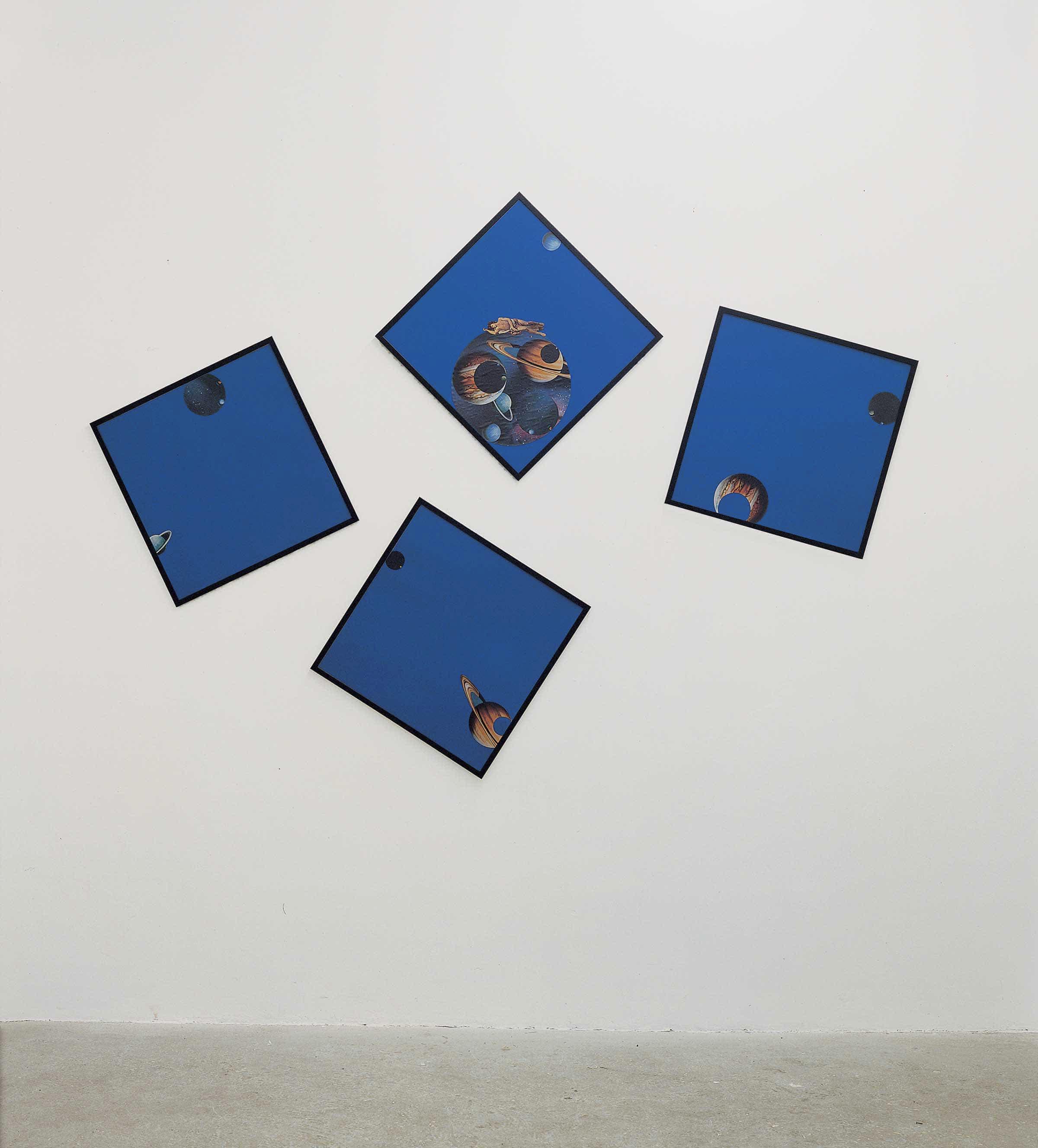 The astral iconography of the four collages on blue cardstock, distributed across the wall in a tilted position and in random order, is dominated by the cut-out figure of the sleeping Narcissus – from Echo and Narcissus, ca. 1630 by Nicolas Poussin – who in the collage in the middle is lying on the upper margin of a sphere made up of an ensemble of planets.