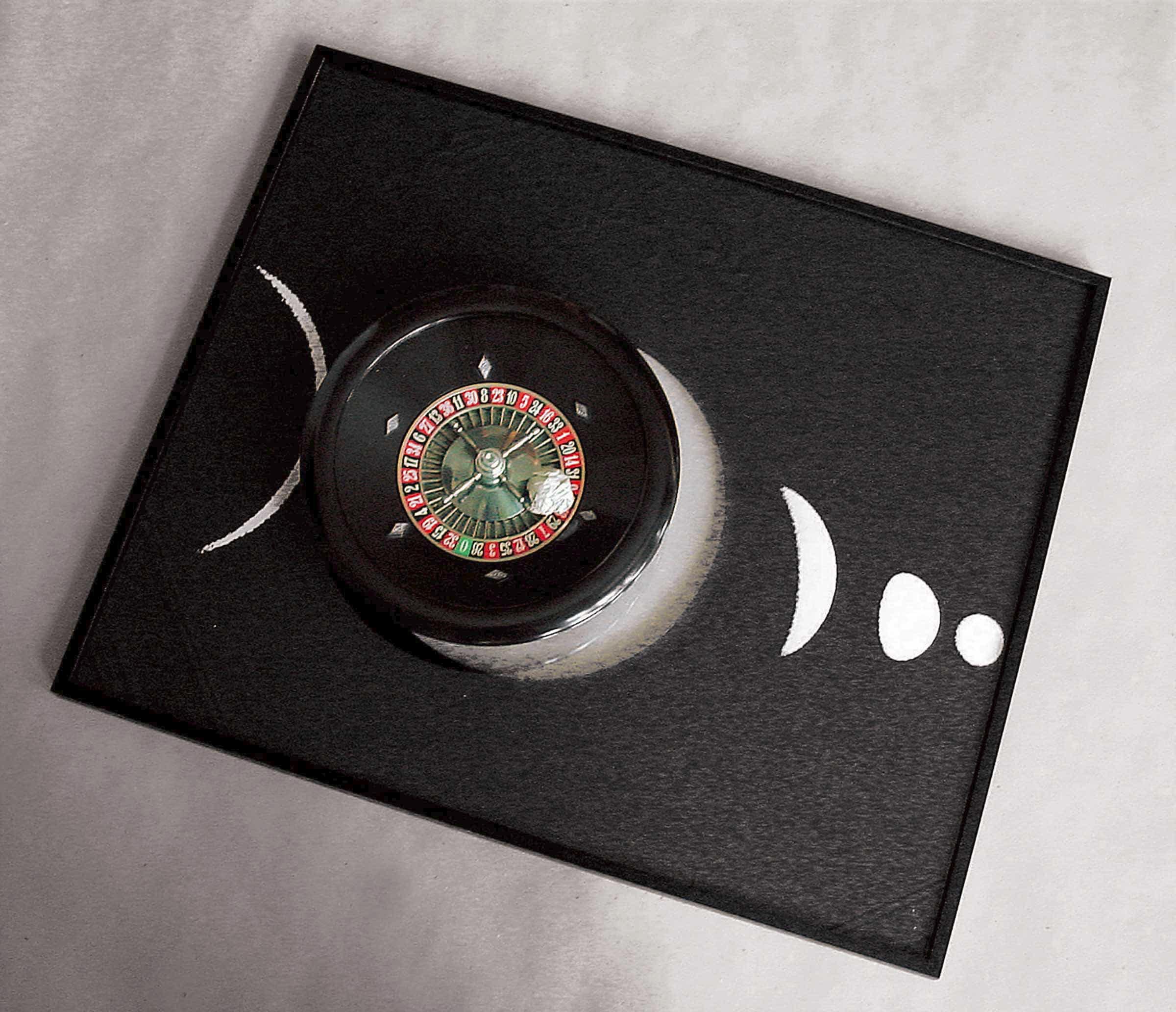 A roulette wheel is placed on the reproduction of the phases of Venus, in the area corresponding to the second phase and in a slightly staggered position with respect to the circle of the planet, which has been cut out so that the void can be glimpsed. On the roulette plate, as if it were a ball used to play a game, is a crumpled paper fragment of an unknown subject (secretly chosen by Gerd de Vries, with whom the artist offered the work as a gift to their common friend Paul Maenz).
