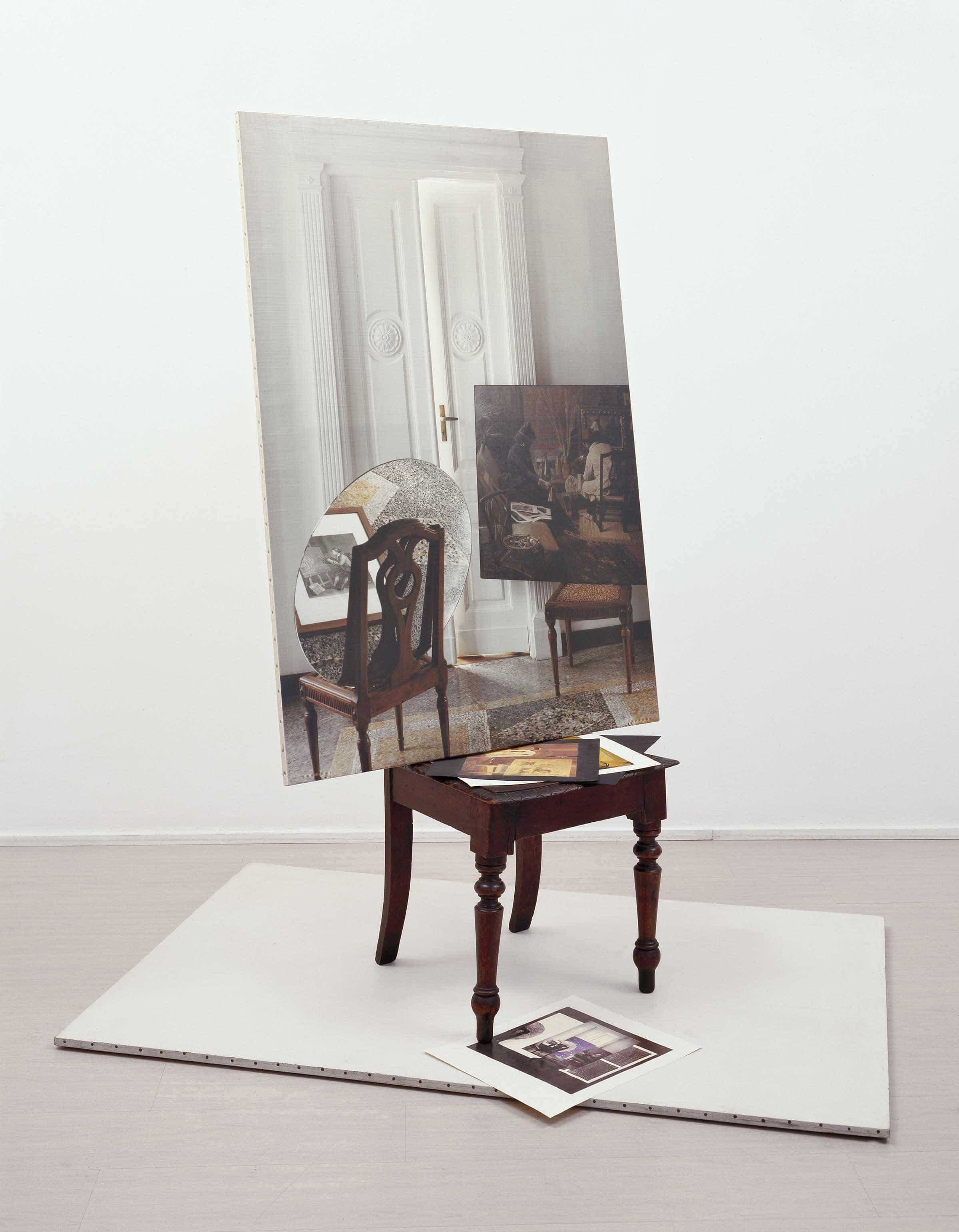 A colour photograph mounted on canvas (printed in positive and without toning) is set down on a chair – similar to the chairs reproduced in the image – which is located at the intersection between the diagonals of a primed canvas lying on the floor. The photograph reproduces a situation that was installed by the artist in the entrance hall of his own home, opposite a door that had been left ajar, with two chairs turned so that one faced the viewer and the other was specular. Standing on the chair to the left was the painting by Angelo Garino Nota intima (1887), while the chair to the right held an oval mirror that reflected the engraving, set down on the floor out of view, that portrayed William Hogarth while painting the Comic Muse.1