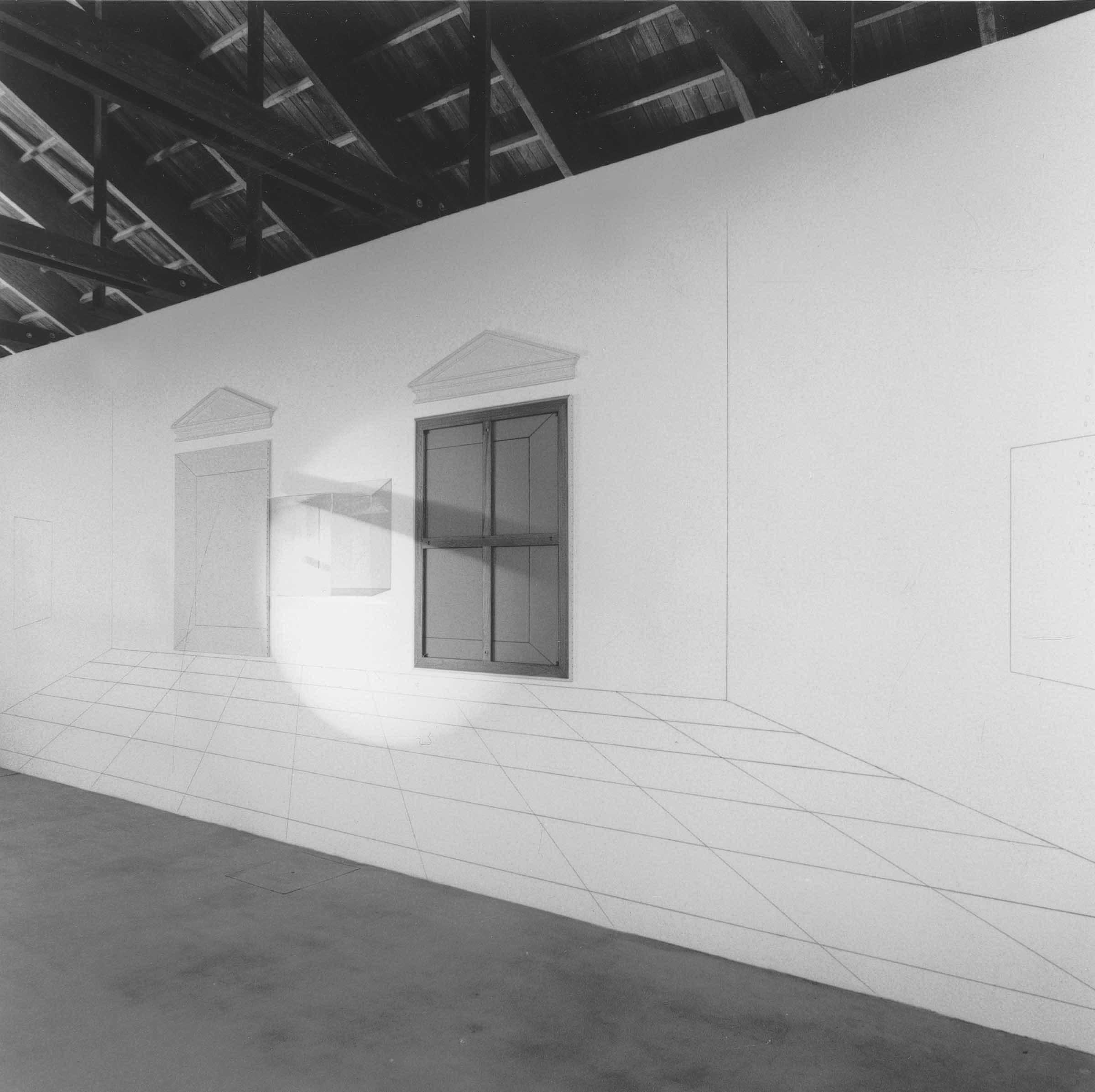 • 1991, Rivoli, Castello di Rivoli: the availability of a very long wall led the artist to integrate the perspective drawing at the two ends with two squares of the same size as the plexiglas case. The work was shown together with Hic et nunc (Le Radeau de la Méduse) (GPO-0680), so that the case received the beam of light emitted by the projector belonging to that work.