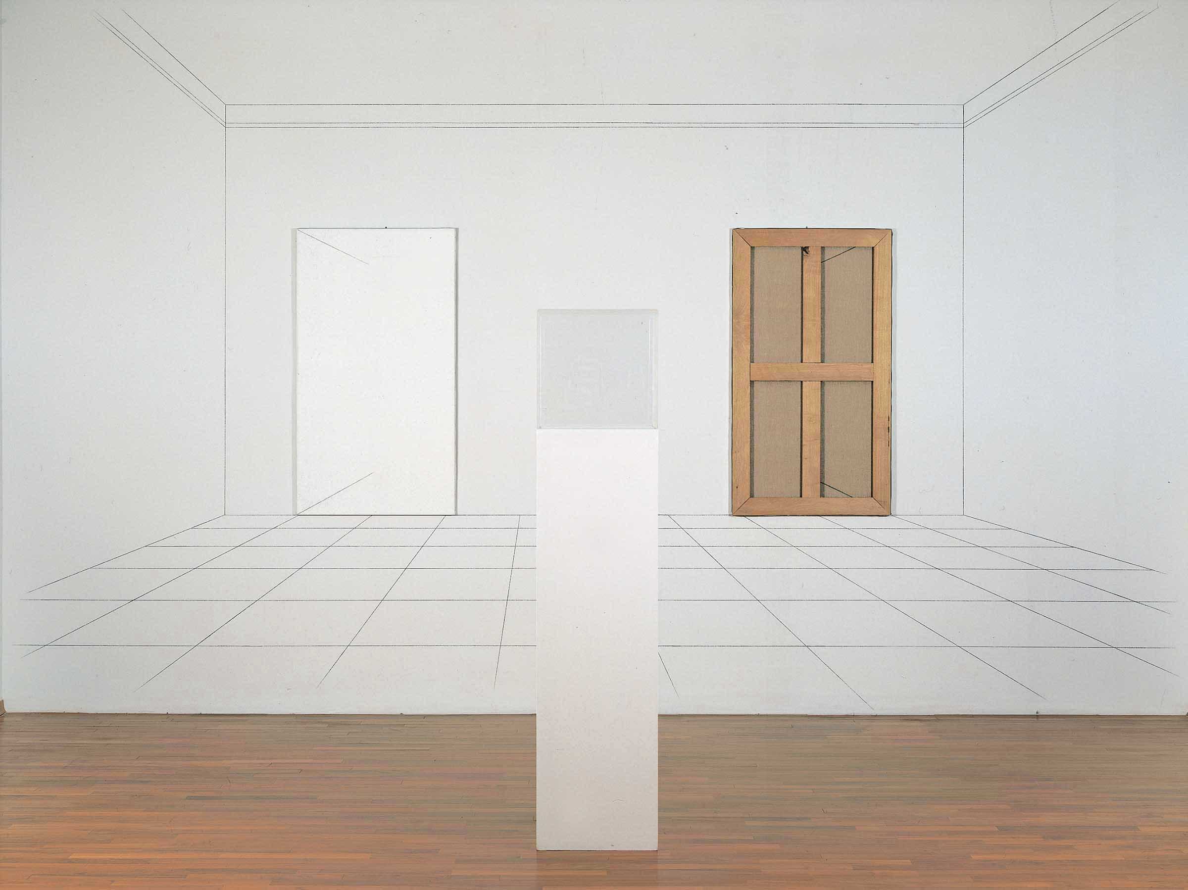 The pencil drawing on the wall locates two canvases – one of which visible from the recto, the other from the verso – in the perspective drawing of a room. The drawing is completed above, so as to prolong the spatial lines of the wall on which it is made, while on the two canvases the prolonging of the perspective is just hinted via the indication of the vanishing lines. Opposite the wall, in the axis of the vanishing point of the perspective and of the optical centre, is an empty plexiglas case.