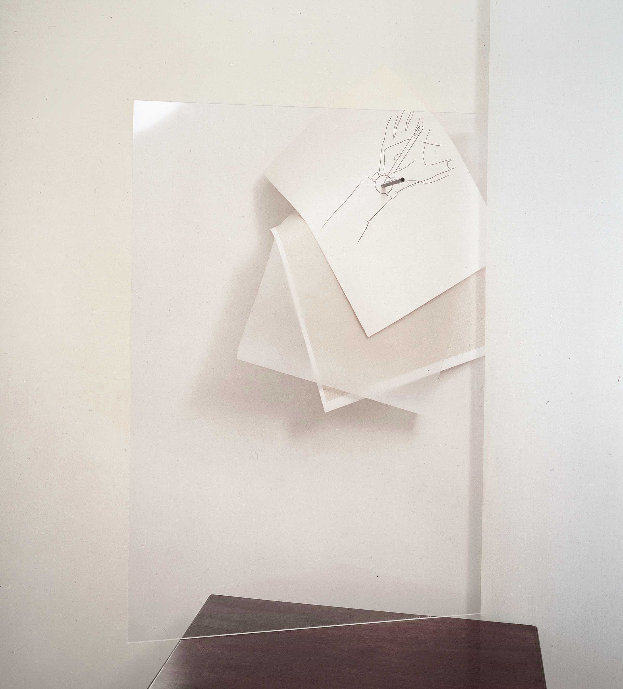 A plexiglas sheet propped up against the corner of a table so that it touches the wall with just one side holds at the top right three paper elements that are staggered in relation to each other: the lithograph made for the print edition entitled Come non detto (1990, GPE-0075), in which one hand indicates with the tip of a pencil the centre of the wristwatch on the other hand; a sheet of tracing paper and a sheet of graph paper. A pencil inserted in the plexiglas sheet pierces the drawing of the two hands in the area corresponding to the drawn tip of the pencil, as if to suggest the absolute instant when all the parts coincide.