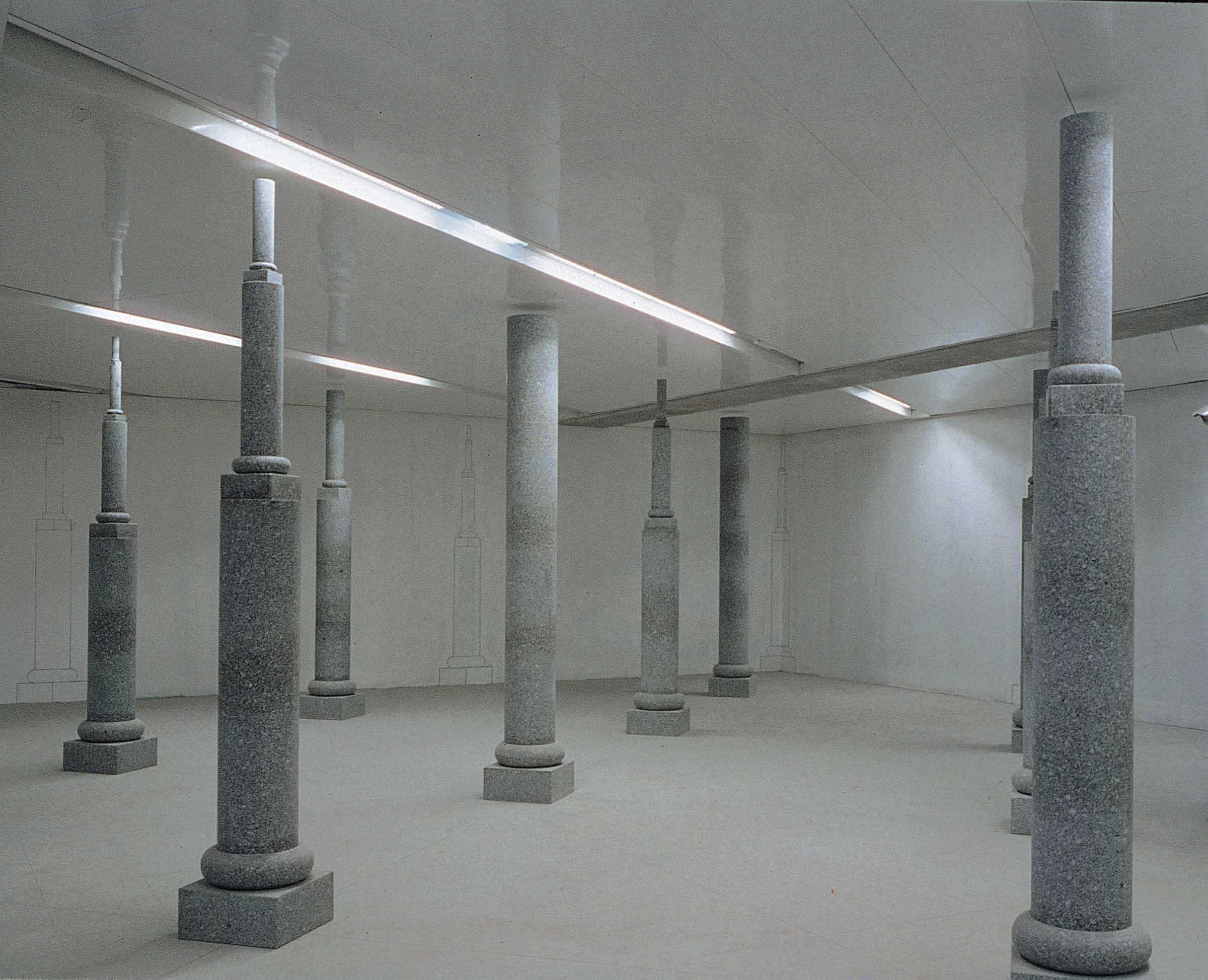 In the area where the automatic ticket machines are located a square pattern set in stainless steel profiles in the pavement – the pattern is oblique to the spatial axes – determines the positions of nine vertical elements made of Grey Tarn granite. Each vertical element, in turn, consists of one, two, three or four columns placed one on top of the other, each of which equal in height to half of the column underneath.2 The nine elements are situated so that each time they mark the vertices of a square in the floor pattern. In the areas where, in proximity to the surrounding walls, the squares are incomplete, the elevation of the missing columns are represented on the walls by stainless steel inlays in the white-painted finishing. Opposite the automatic ticket machines, the two elements that should be located there are represented by a plan view, set in the floor.