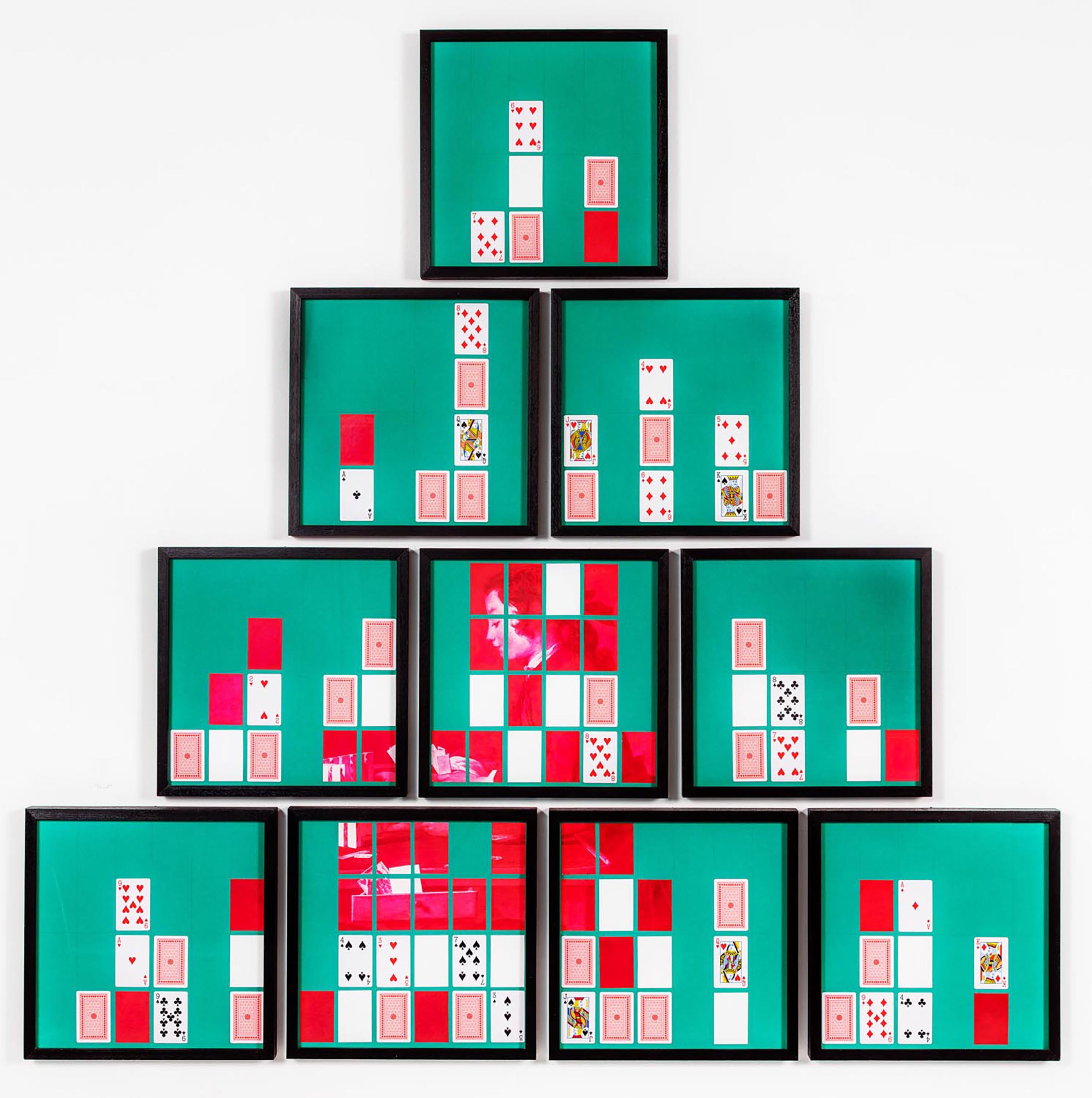 The eight collages on green cardstock arranged at short intervals so that they form a pyramid – a castle of cards as the title tells us – each present a different arrangement of red playing cards, some of which seen from the back, others from the front. Strewn about in between the cards – of the same format as the playing cards – is a photographic reproduction in blue tone of a painting by Jean-Baptiste-Siméon Chardin (Le château de cartes, ca. 1737), in which a young man amuses himself by building castles of cards on a green game table.