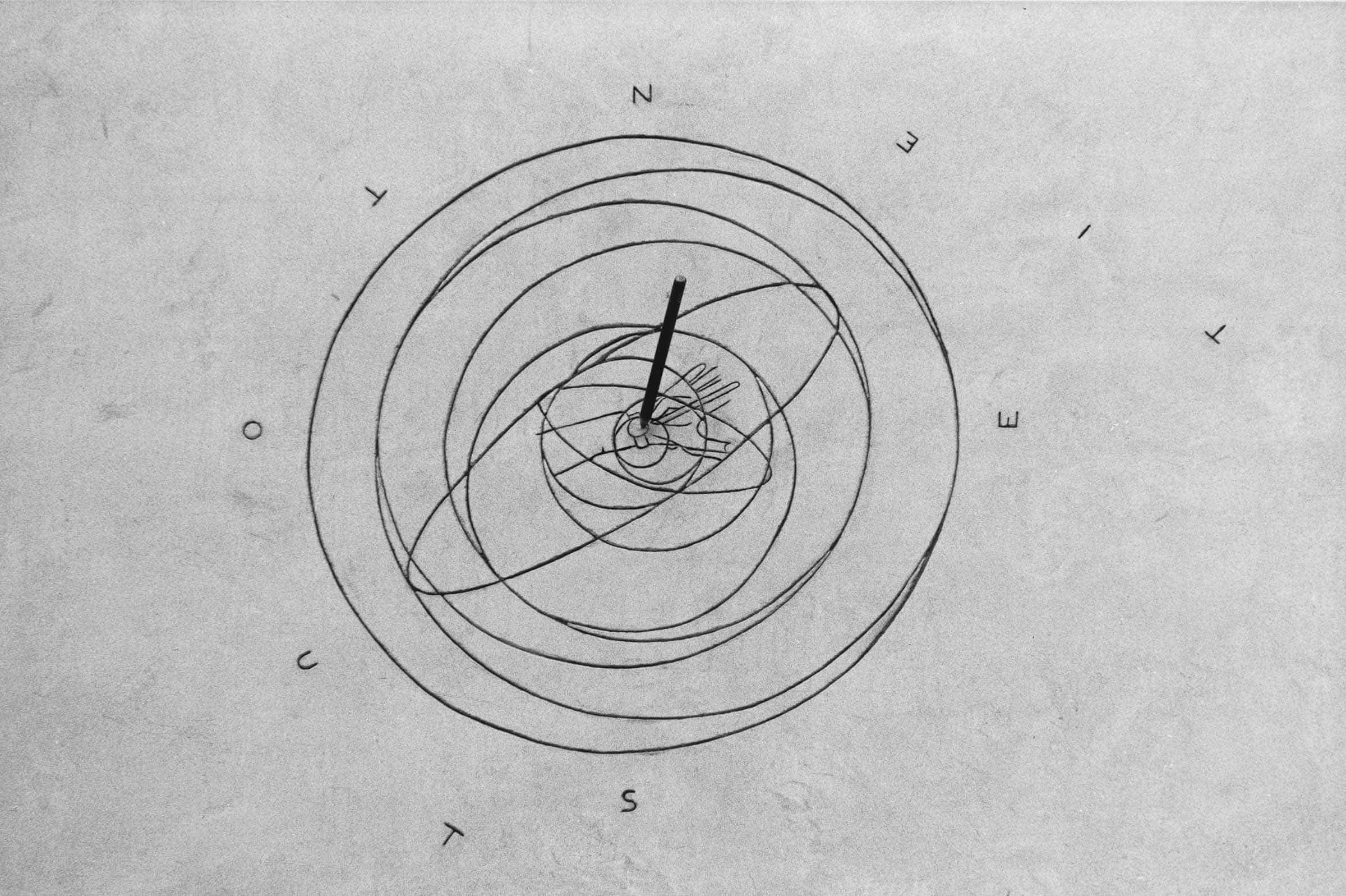 The drawing carved in the white-painted quadrant combines two concentric motifs: a hand intent on using the tip of a pencil to mark the centre of a wristwatch on a second hand, and an orbital pattern of circles and ellipses tangential to each other originating from the circle of the watch. A bronze slightly tilted pencil is fastened to the tip of the drawn pencil. The bronze pencil marks the start of the two drawings and at the same time it serves as a gnomon. Arranged in circle around the astral motif are the words “Tout se tient” (Everything holds together), so that they begin and end with the letter “T” and involve within their orbit the four cardinal points, i.e. “O” (west), “S” (south), “E” (east), “N” (north). The French expression was first used by the linguist Ferdinand de Saussure to designate a whole in which all the parts are coherent and interrelated: in this sense it refers to the celestial iconography – evoked in the orbital drawing – which represents par excellence the model of perfection in which all is fulfilled.