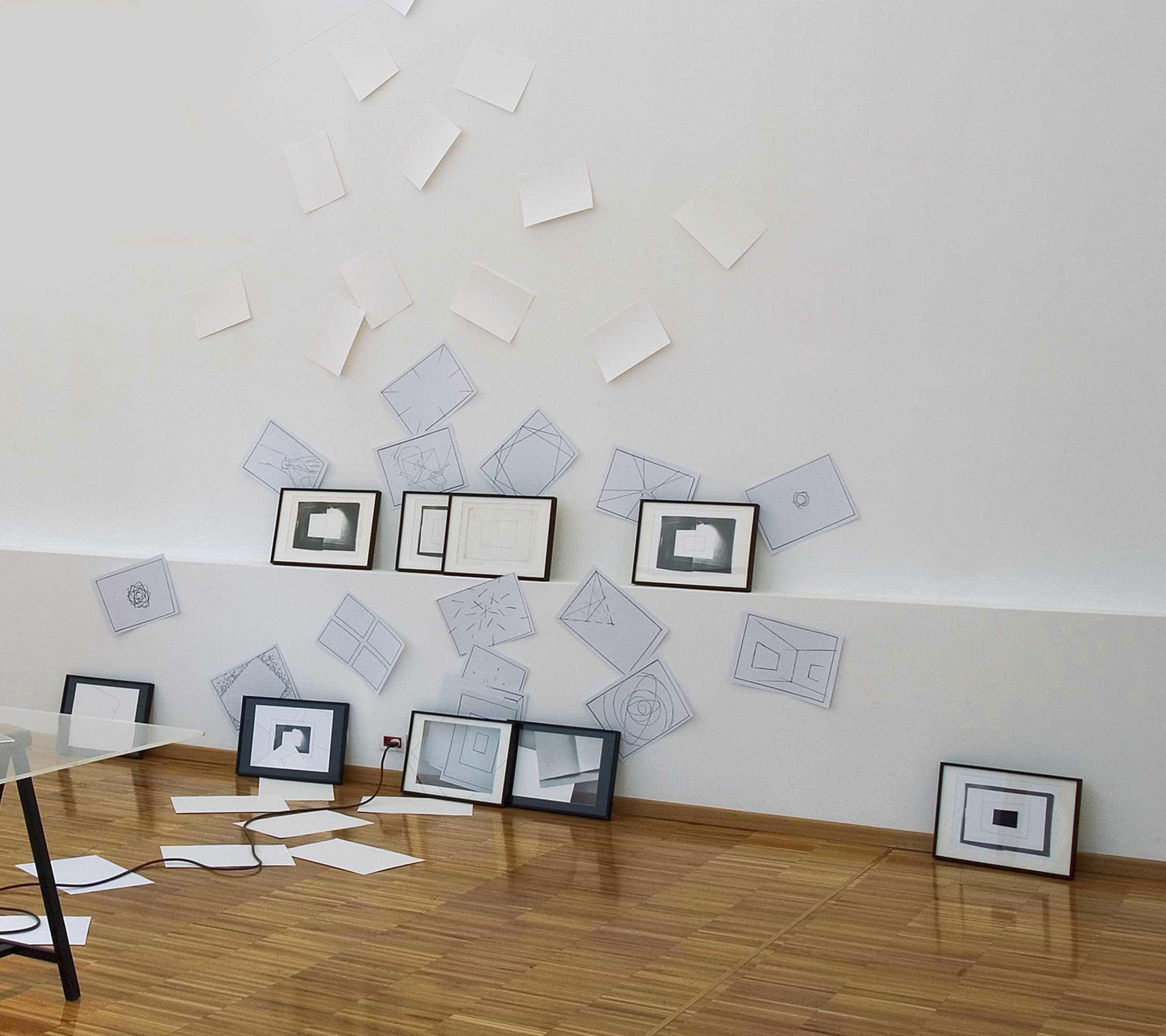 • 2006, Bergamo, GAMeC: the nine elements – arranged in part on a plane that protrudes just slightly from the wall, and in part on the ground – are integrated with sixteen drawings (planetary orbits, the image of a hand drawing, vanishing points, ensembles of squares, etc.) scattered around the frames, as well as a "fall" of blank sheets from the top of the wall all the way to the ground.