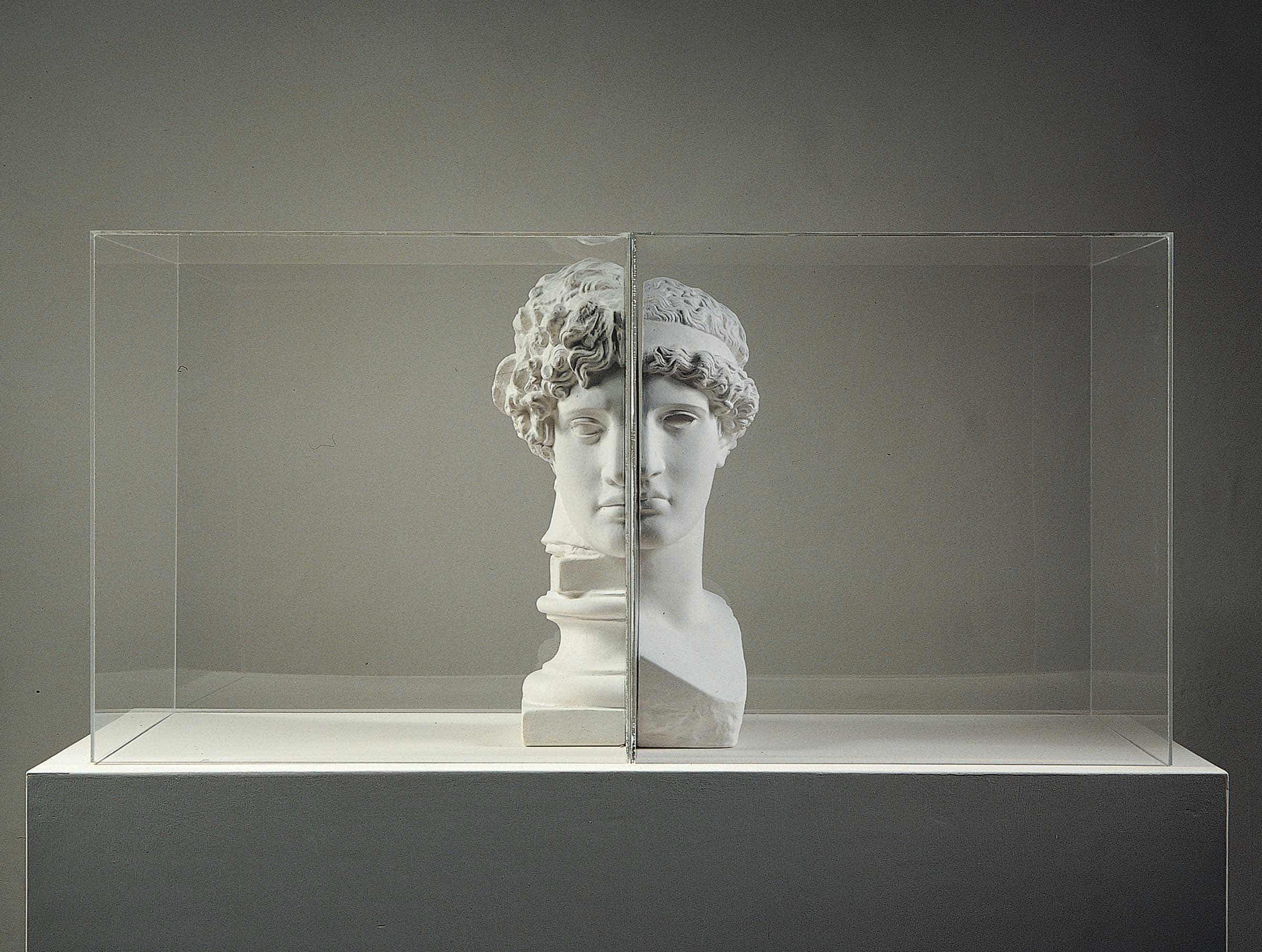 Two plexiglas cases placed close together on a plinth – the sides in contact mirror each other – hold the two half plaster casts of two antique heads, arranged close to the reflecting side. In the case to the left is the left half of a male classical head, while in the case to the right is the right half of the head of the Athena Lemnia.