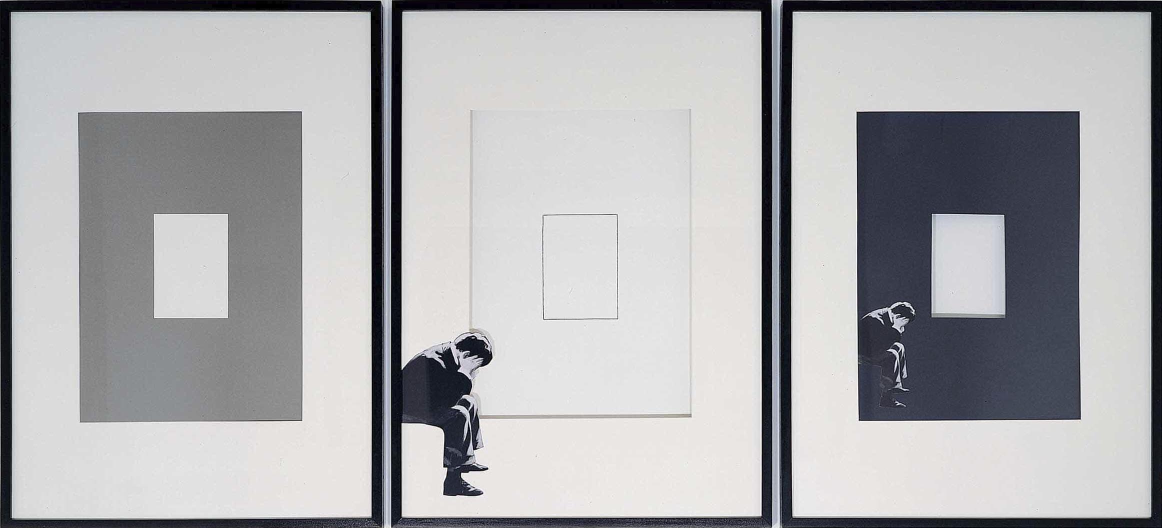 A male figure is seen sitting, immersed in thought, at the centre of an alternating sequence of fulls and voids, darks and lights. In the first of the three elements placed at short intervals, a white passepartout frames a grey sheet featuring a white rectangle applied to the middle. In the central element, a white passepartout allows the viewer to glimpse a small rectangle drawn on the wall. In the third element, a white passepartout frames a black sheet with an empty rectangle at the centre.