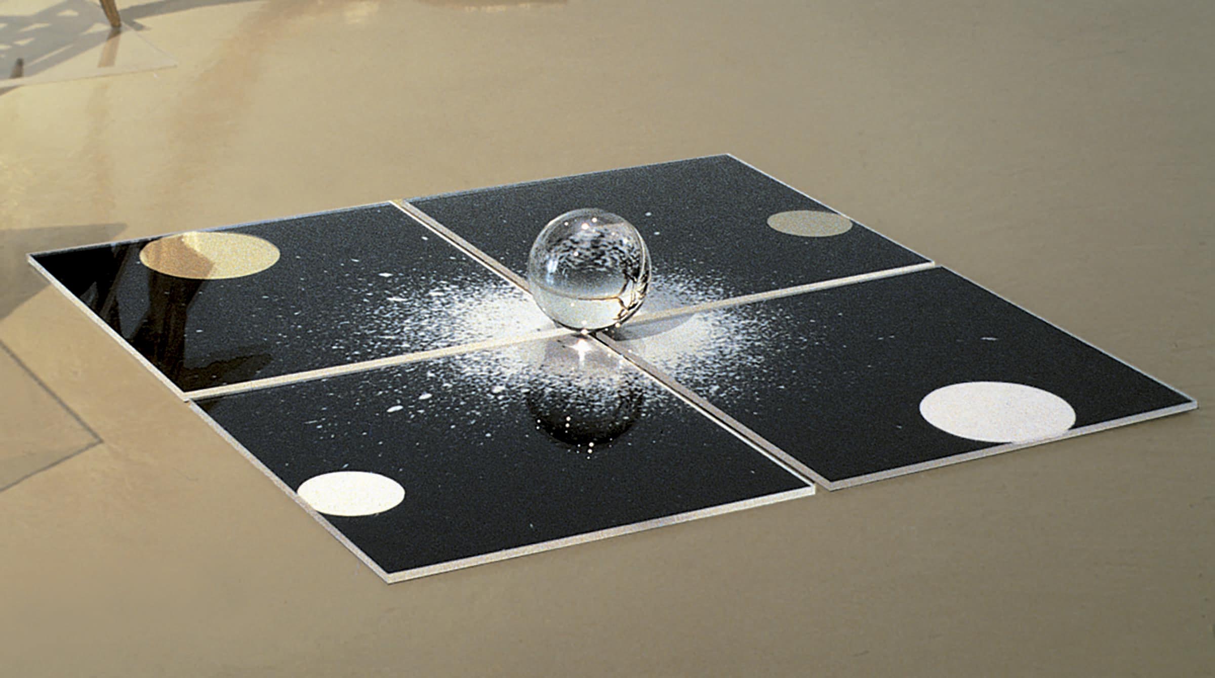 The photograph that is divided into four parts, arranged on the ground at short intervals, and each of which is held down by a plexiglas sheet, reproduces a white nebula against a black background, which is formally corroborated by the crystal ball at the centre, in the point where the four elements converge.