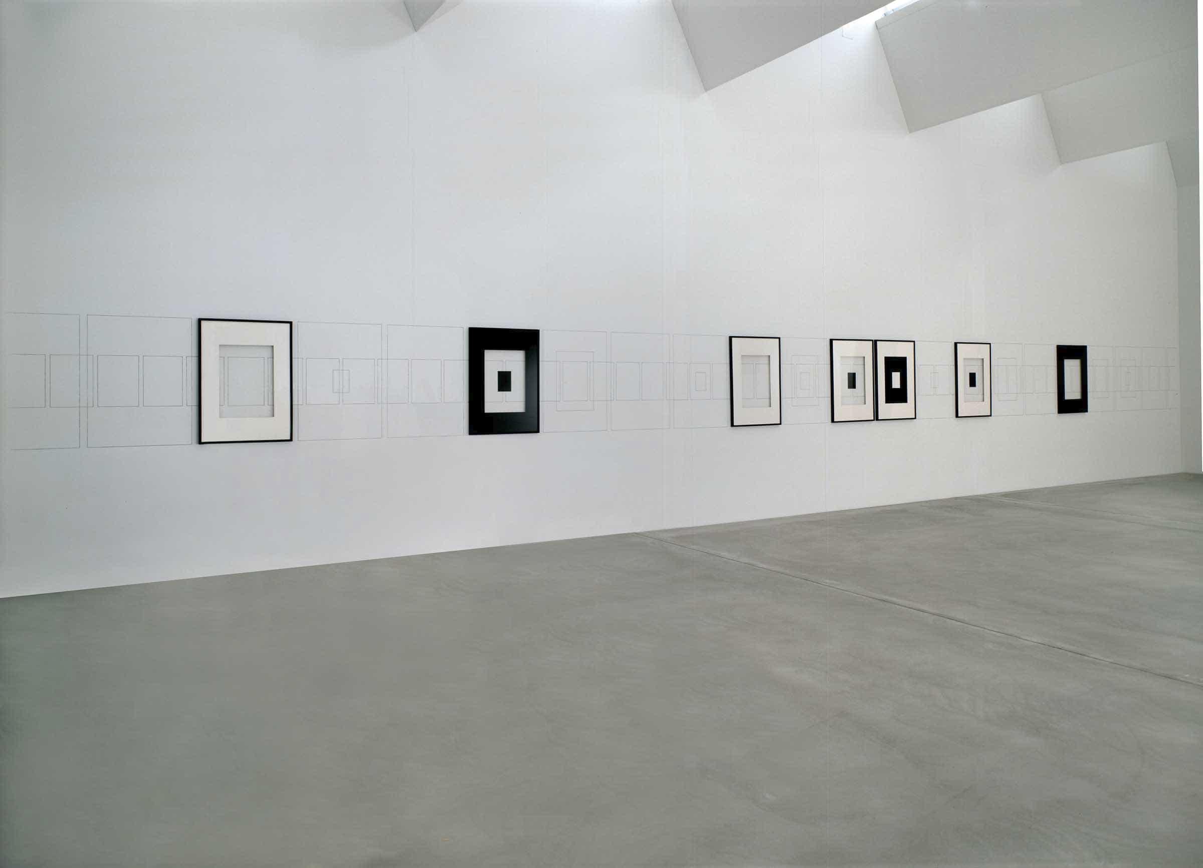 This continuous frieze, which varies in length depending on the length of the wall available, consists of a series of frames with white or black passepartouts, doubled inside by two proportionally reduced black or white rectangles (some of which are contained by the frame, either drawn or applied to the wall), and irregularly alternated with identical units drawn on the wall. Within the overall sequence, the alignment of the squares of the same format each form a frieze-within-a-frieze.