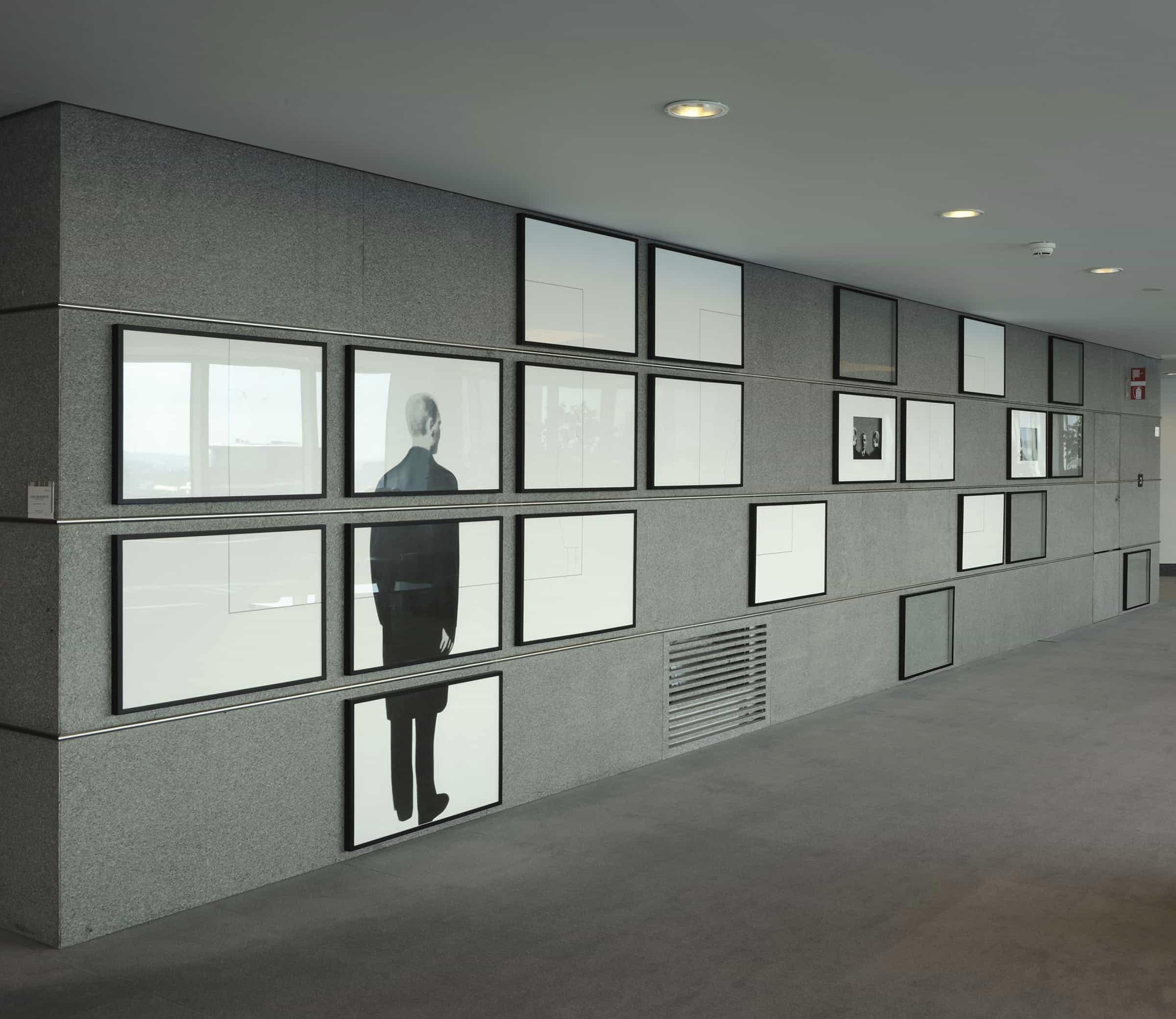 The work commissioned for a corridor that leads to a series of offices is installed on two walls interrupted by a passageway. Forty black frames lined up in four rows marked by the steel profiles make up an irregular grid of fulls and voids. Some of the frames enclose straight lines, which in the work as a whole recall eight paintings; other frames are empty, and others still reproduce the details of figures that together allude to eight viewers of the eight hypothetical paintings (hence the title "otto per otto" [eight by eight]).1