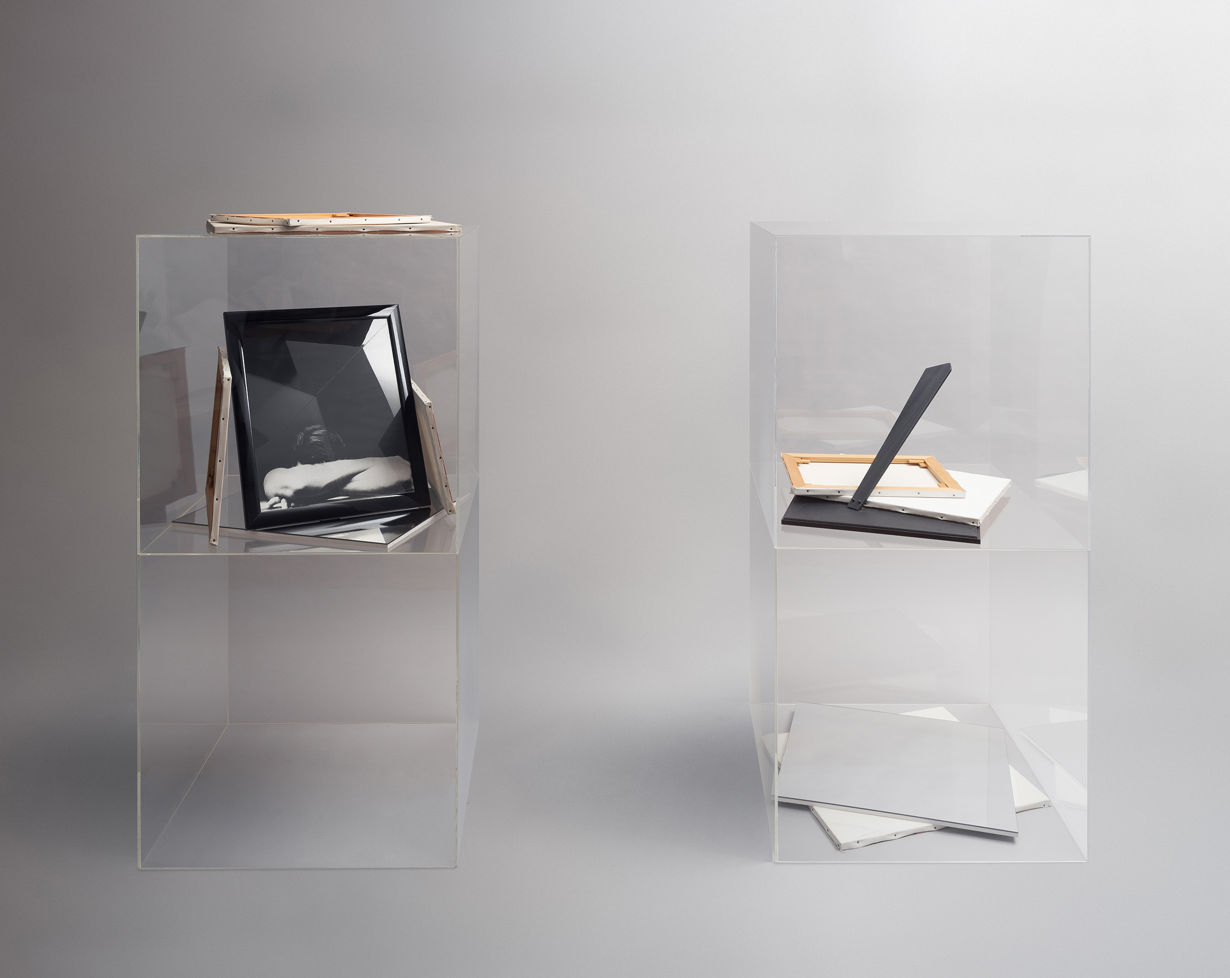 Plexiglas volumes, photo frames, photo print, primed canvases, mirror