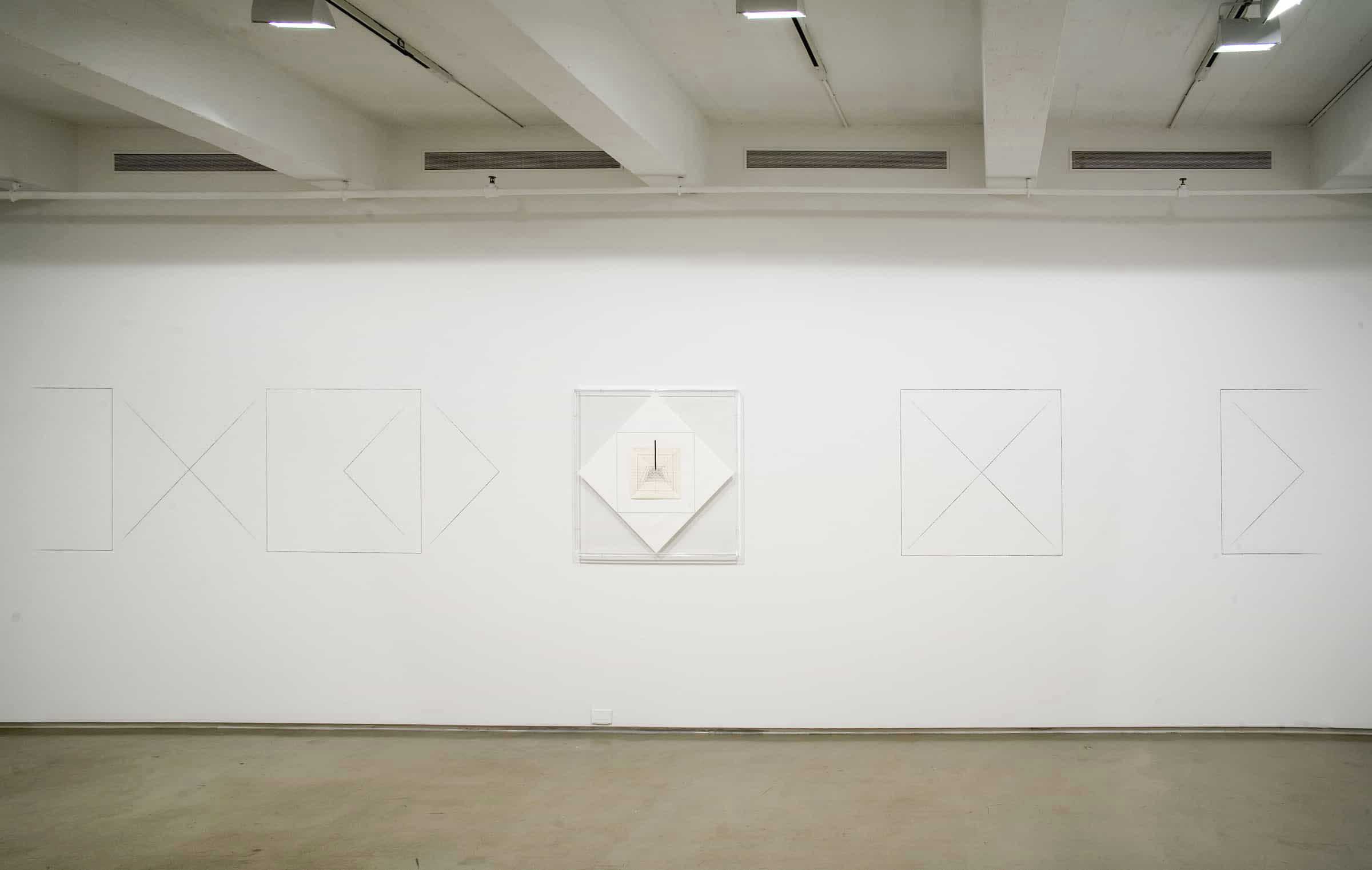 The print edition entitled Suite n. 4 that is arranged inside a plexiglas case acts as a generating nucleus of the drawing developed on the wall, to the sides of the case. The drawing reproduces, in mutating combinations, the motifs of the square, the rhombus, and the diagonals that distinguish the print.