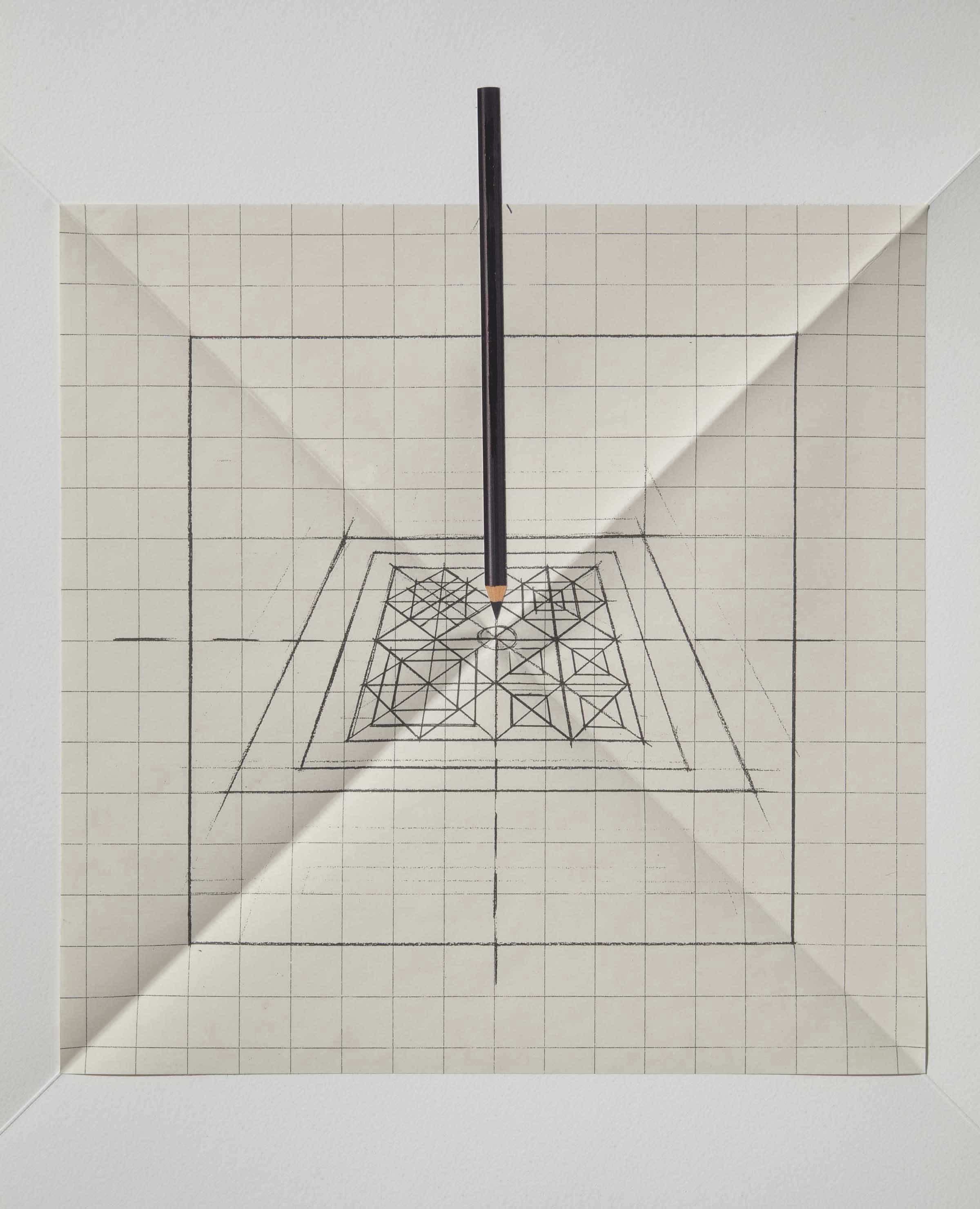 The lithograph consists of a folded sheet, so that in the open position, turned obliquely, the folds correspond to the diagonals of the perimetral square and the square of the squared paper applied to the centre. The latter offers the image of a black pencil, which marks the centre of a perspective drawing of squares and rhombuses, in turn inscribed inside a square, marked by dotted lines corresponding to the median axes (the whole implies the intersecting of spatial planes).