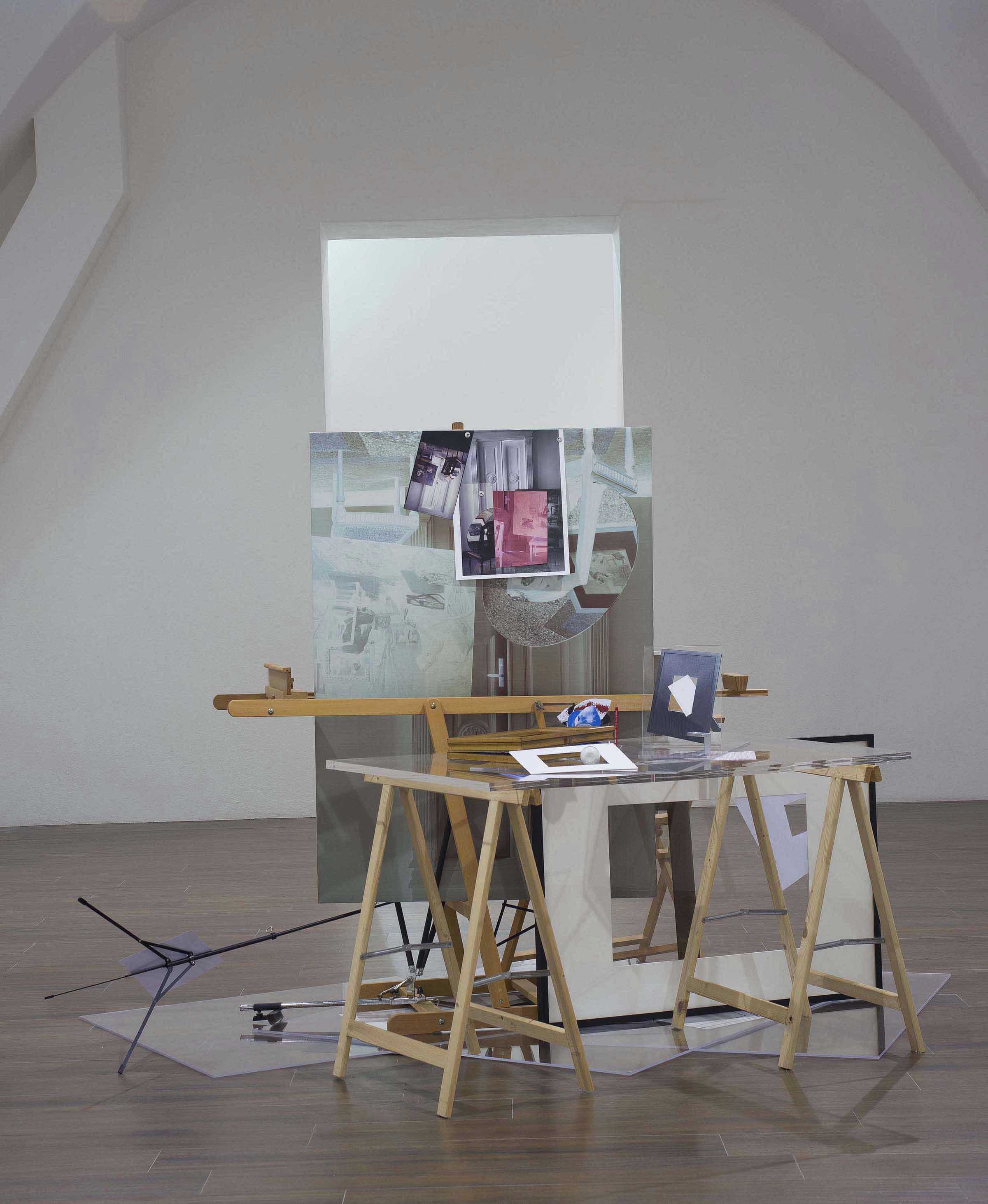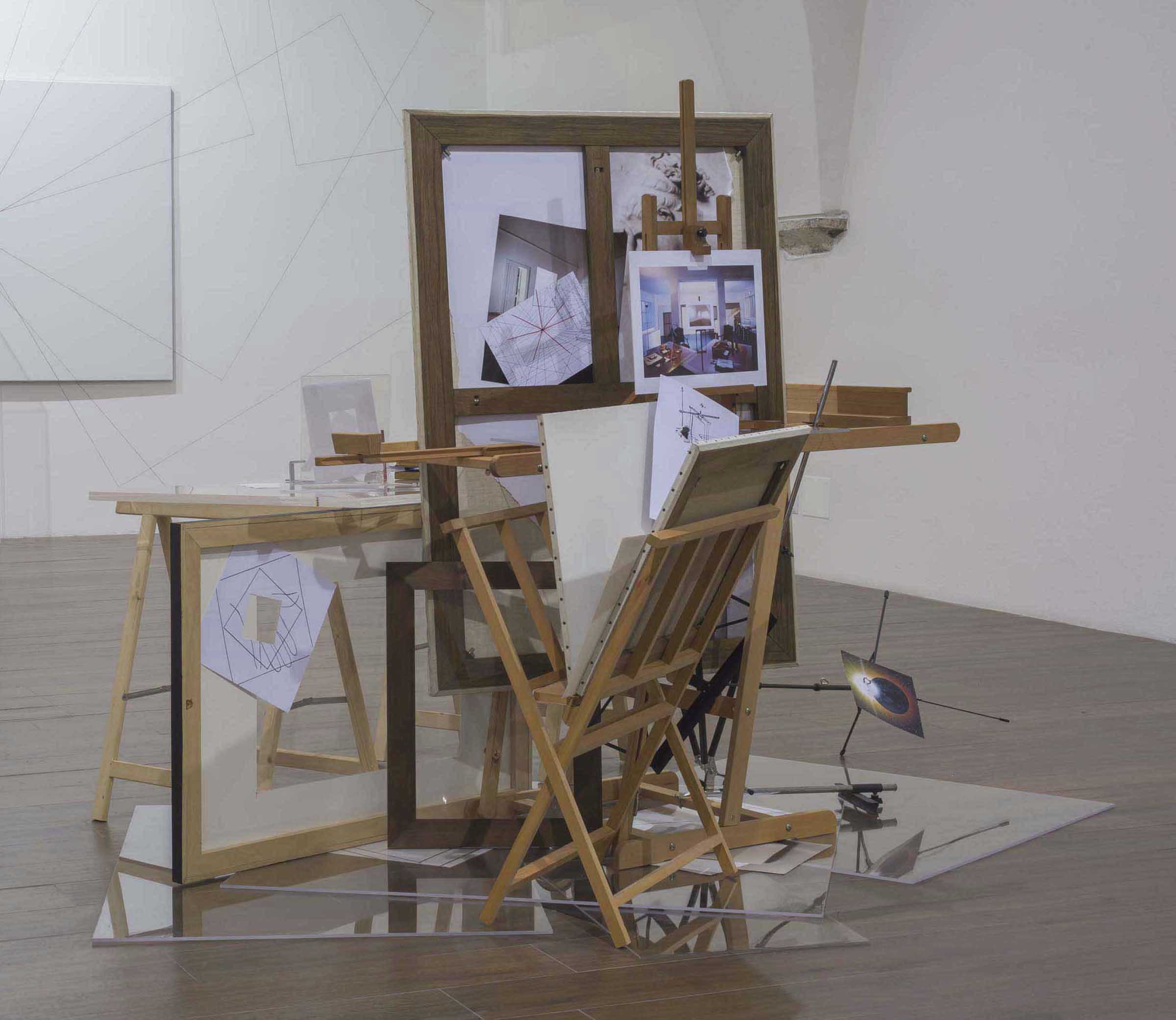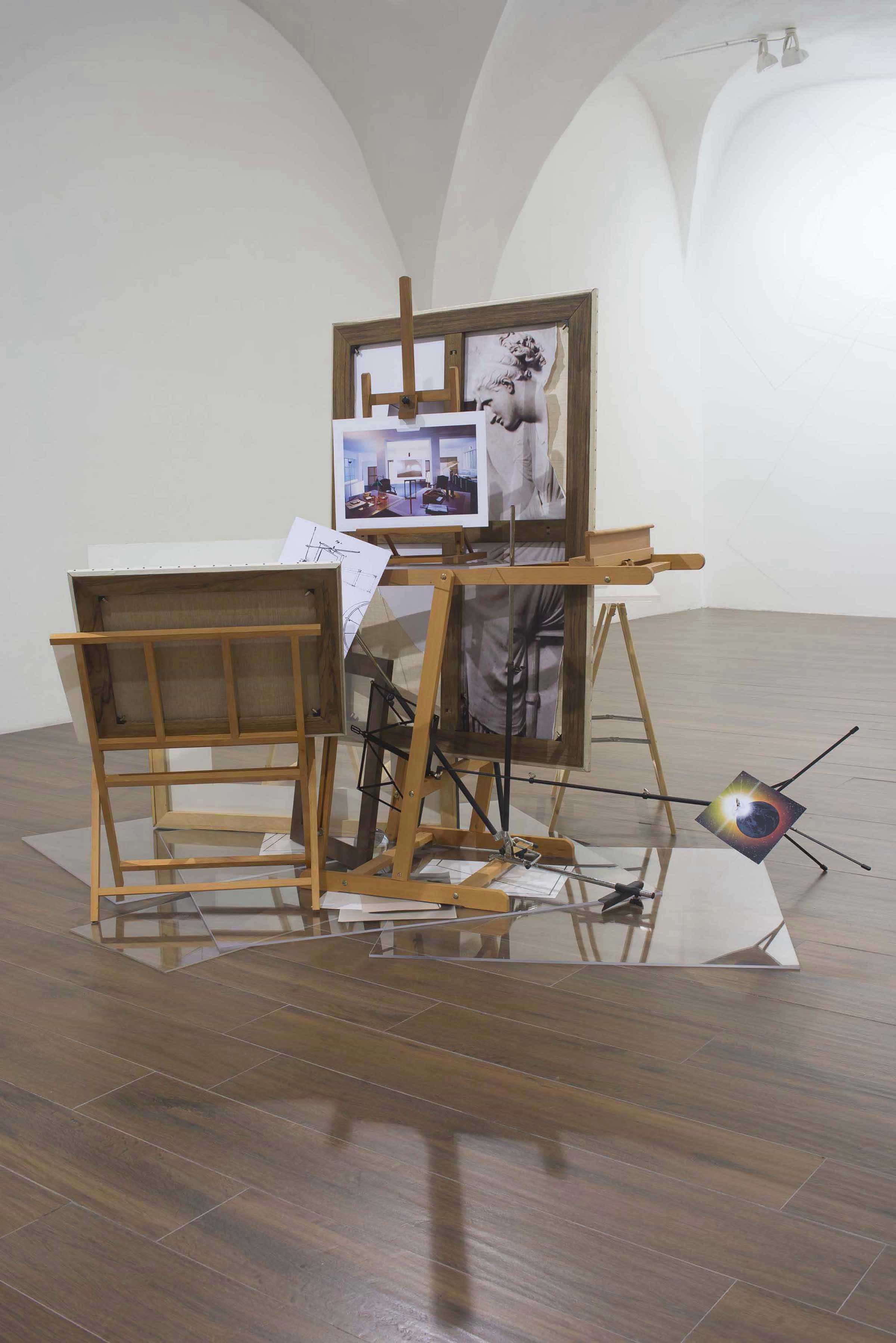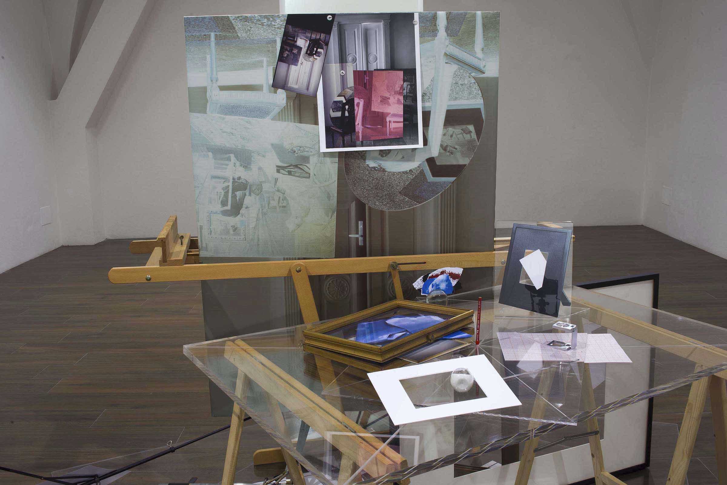 Plexiglas sheets, wooden trestles, photo print applied to canvas, frames, primed canvases and various objects