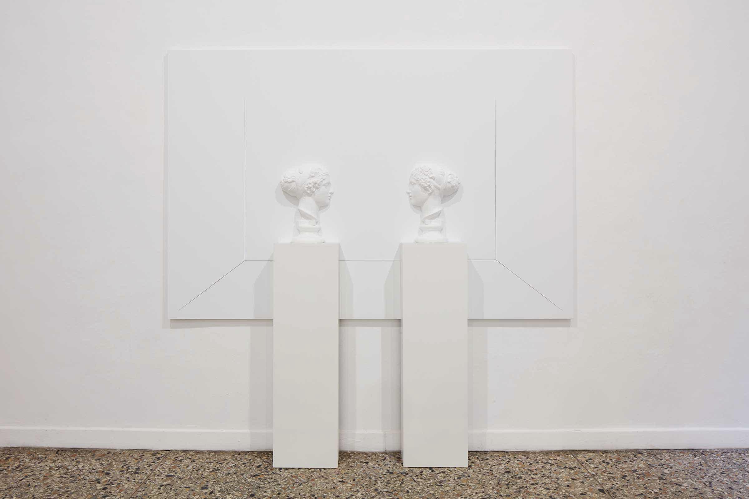 The two halves of a plaster cast of the head of a Hellenistic kore are arranged to face each other – vis-à-vis as the title tells us – on two plinths positioned up against the primed canvas hanging on the wall. The pencil drawing recalls a room in perspective.
