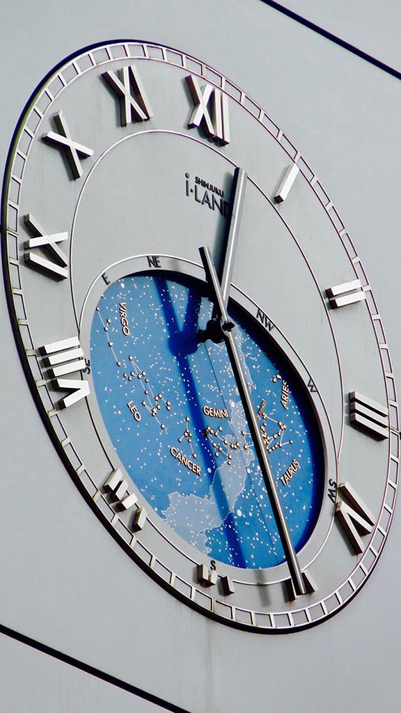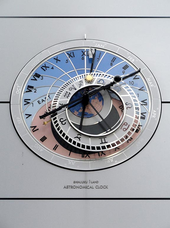 The artist’s intervention on the eastern and western facades of the Clock Tower in the Shinjuku I-Land complex in Tokyo includes two clocks, produced by Seiko in collaboration with Giulio Paolini. The first clock, on the eastern facade, is inspired by the famous astronomical clock in Prague, reproduced with some minor variants: a different outer circle – which shows the months and the days, instead of the Arabic numerals and the old Czech Time in the Prague model – and another hand at the far end of the hand with the sun, indicating the date on the outer ring with a pencil.
